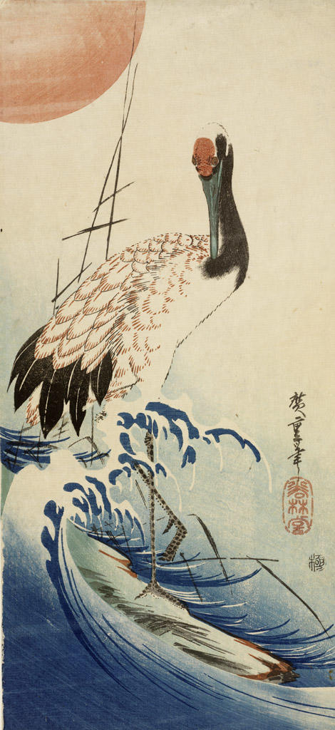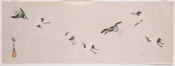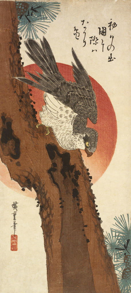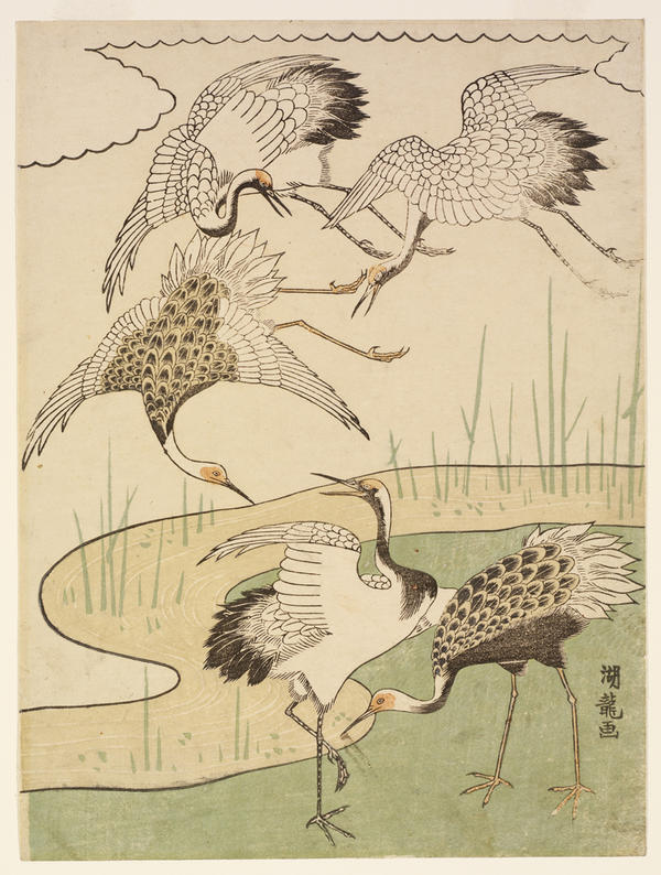 The Museum is fortunate to have a number of late eighteenth and early nineteenth century prints and surimono (deluxe, privatelycommissioned prints) that were probably used to celebrate the New Year. Surimono were distributed as New Year's greeting cards among members of small literary circles. Several surimono prints make reference to the year of the horse in the Chinese zodiac which coincides with the zodiac sign of the current year. Moreover, images of cranes or falcons, especially pictured with the rising sun, have long been associated with New Year's celebrations. The crane motif, symbolic of longevity, functions as an auspicious prayer for long life and happiness. The falcon is one of three lucky omens in the tradition of "the first dream." Traditionally, a vision of Mt. Fuji, falcons or eggplants in one's first dream of the new year foretells a happy year. Another popular motif is that of the treasure ship takarabune, a wooden sailboat laden with riches and often bearing the Seven Gods of Good Fortune. Paintings of takarabune were often placed under one's pillow on New Year's Eve in hopes of having lucky dreams.