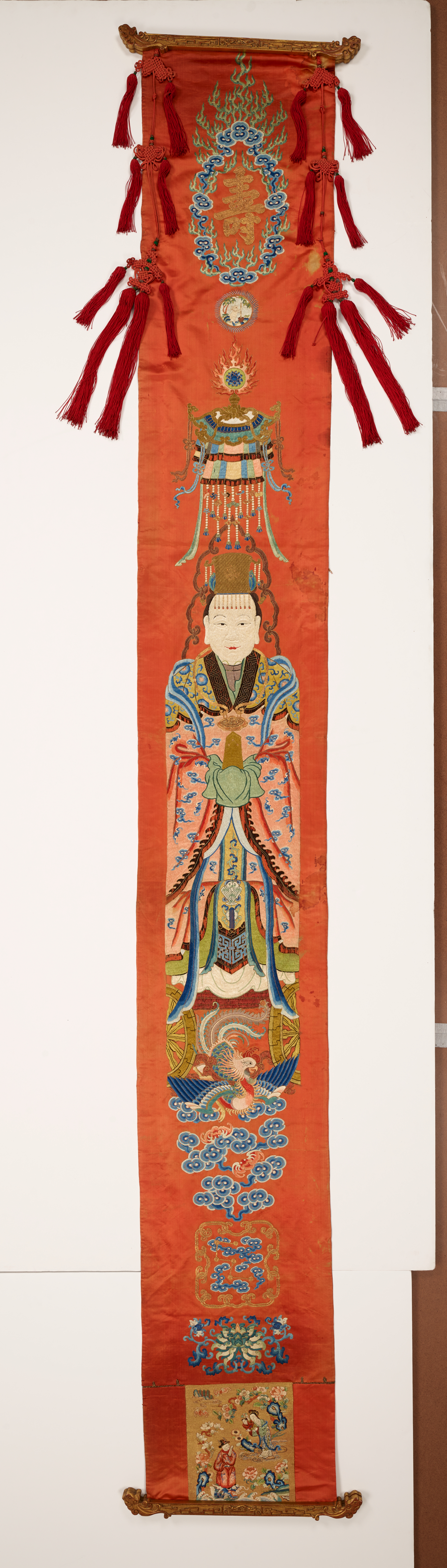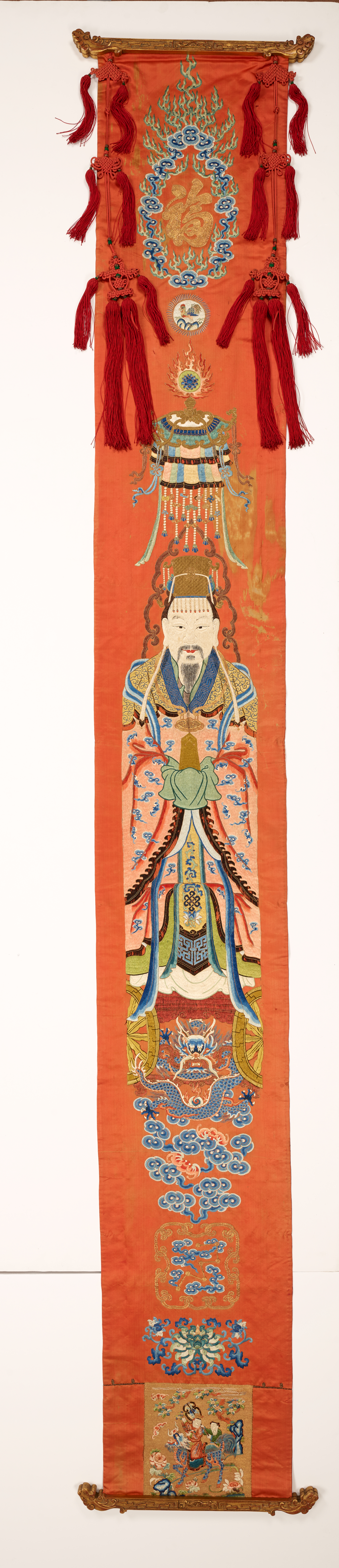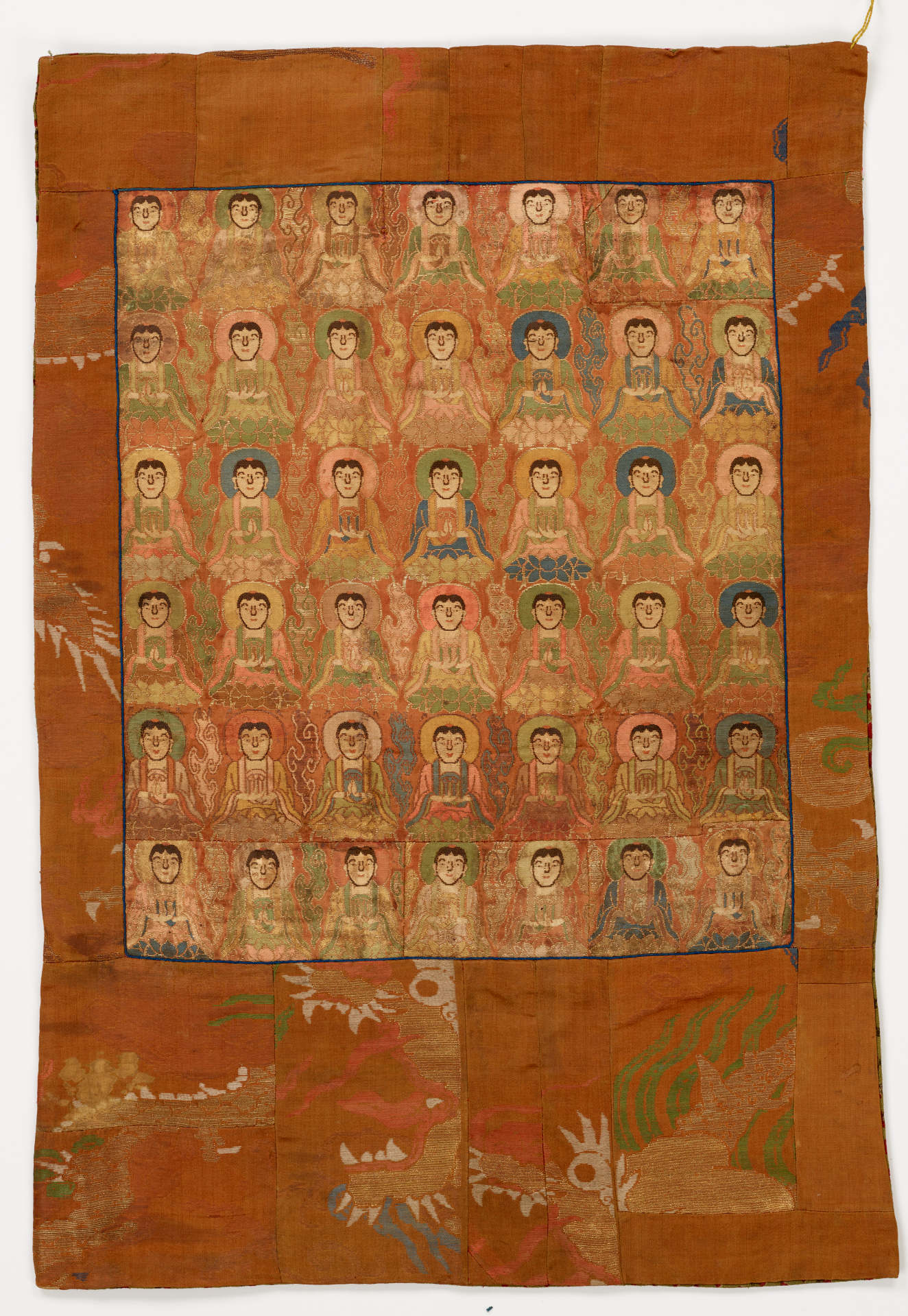 Chinese textiles embody a visual vocabulary reflecting its complex religoius and secular culture ranging from Confucianism to Taoism to Buddhism. The embroidered gauze altar colth (55.212), originally a summer robe, shows on its lower border a mountain peak (symbol of earth) rising out of diagonal stripes (heaven), a depictino of the Confucian universe. The white elephant depicted on another altar cloth (55.226) symbolized strength, wisdom, and prudence. On his back he carries auspicious objects representing the universe.