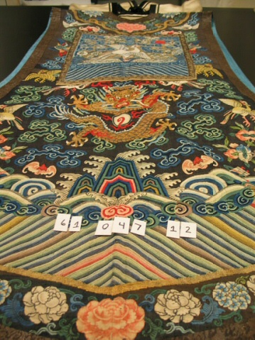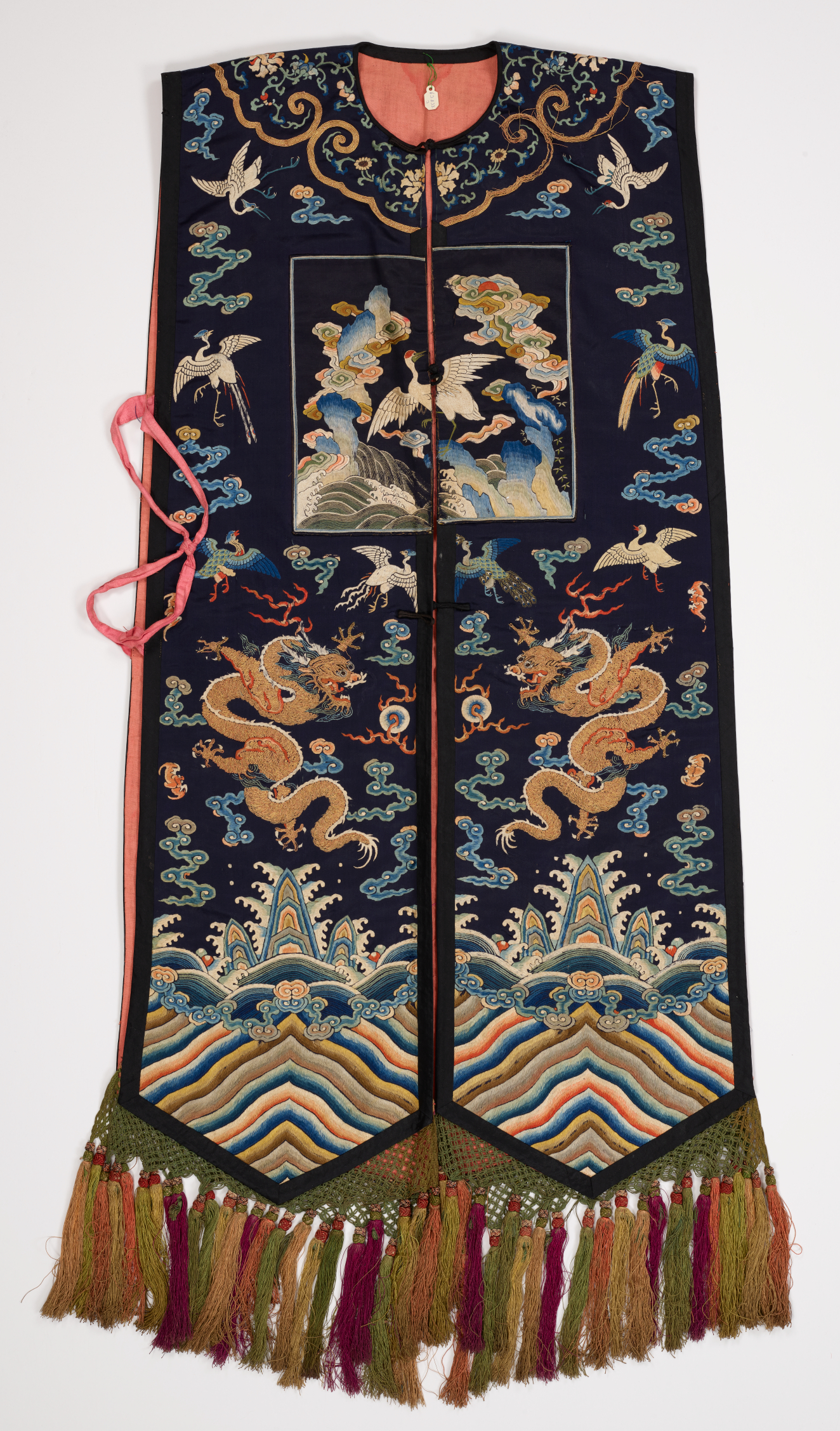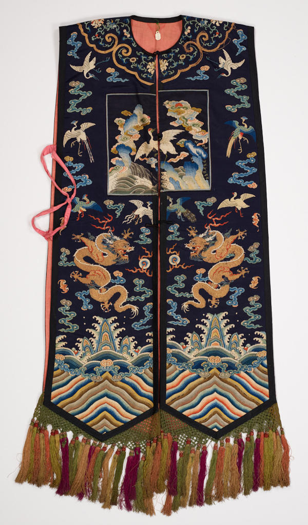 The Manchu government attempted to forestall their cultural assimilation by the Chinese, a tendency witnessed by previous foreign rulers of the vast nation, through the implementation of a military and political structure that ensured the separation of conqueror and conquered, while maintaining the Confucian-based Chinese bureaucratic system already in place. The Manchu also emphasized the obvious cultural attributes that denoted their ethnic difference, such as language and custom, but among the most visible distinctions were the changes they made in court costume. By changing court attire from cumbersome, flowing robes and slippers that turned up at the toes--the style of dress for the Ming court--to more functional wear based on the riding coats, trousers, and boots of the nomadic steppes, the new rulers established their national dress as a visual symbol of authority that celebrated their origins. The selection of robes, coats, and accessories from the RISD Museum's costume and textile collection on display here is intended to represent both the Ming and Manchu styles of Ch'ing Dynasty men's wear, and includes both secular and religious garments.