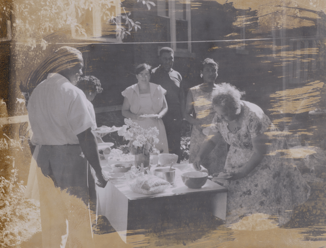 Black and white party snapshot of five smiling dark-skinned, well-dressed adults. One man wears a pointed paper hat, the couple at left are dancing, and another woman holds a noisemaker.