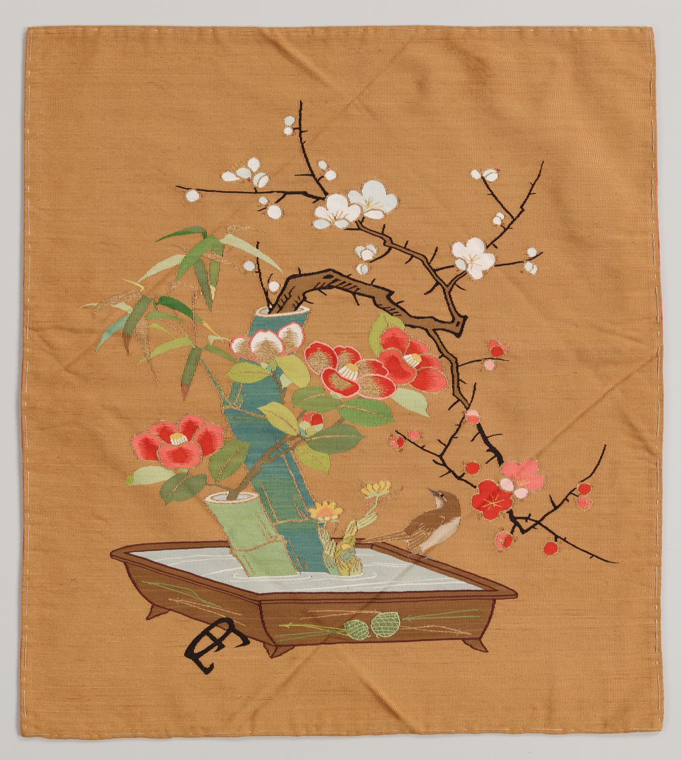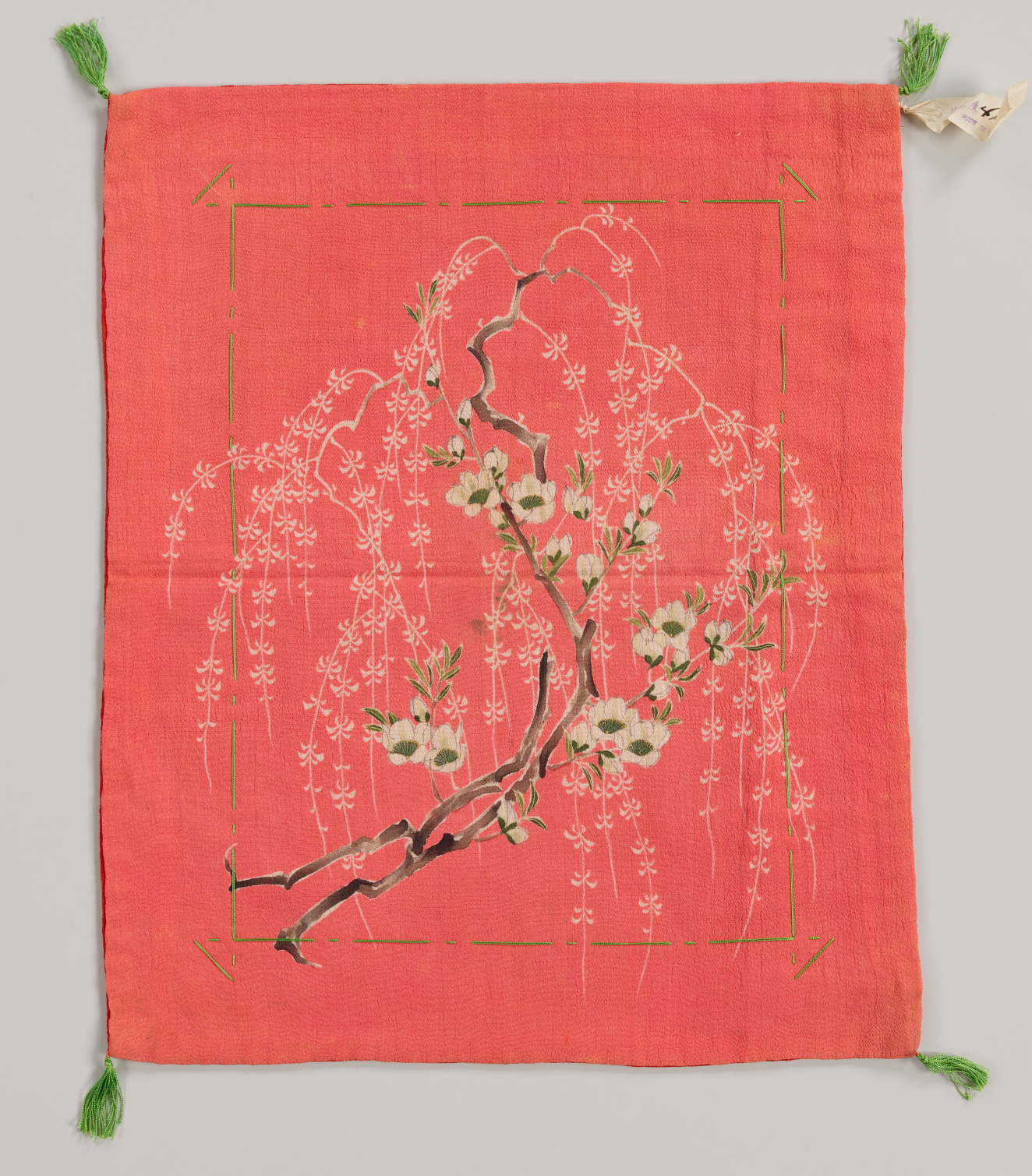 During the Edo period in Japan (1615-1867) it was customary to give gifts on many occasions, including weddings, births, a child's first day of school, and the Thirteenth Year Ceremony celebrating the attainment of manhood. Annual festivals like the celebration of the New Year, the Cherry Blossom Festival, or the Tengin Festival also called for the presentation of gifts. WIth typical Japanese ceremony, these gifts were covered with a rectangular cloth or fukusa, which was later returned to the giver. The design of the fukusa was specific to the occasion for which the gift was being presented, and, on a more symbolic level, served as an indication of the giver's wealth, scholarship, aesthetics, and cultural sensitivity.