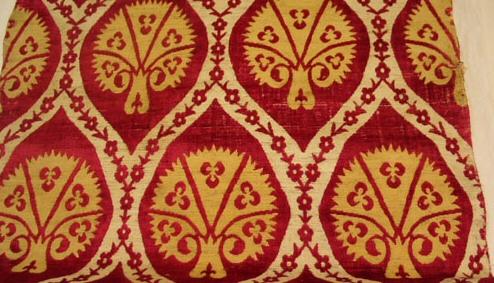 Islamic textiles also played an important role in court disdplay and in royal exchange. Silk was the preeminent luxury fabric, prized for its sheen. Silk costumes, like the Mughal robes displayed in this gallery, announced an individual's identity and social rank. The Safavid helmet and Mughal dagger on display in this gallery served a similar social role in the court context in addition to their practical function in combat.