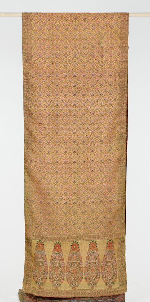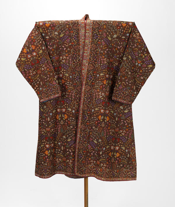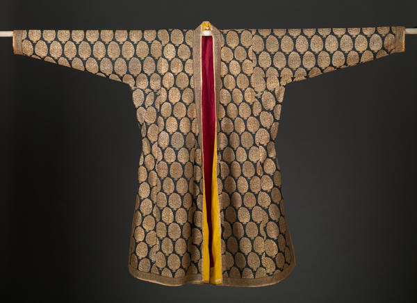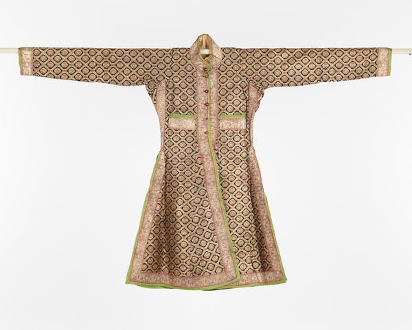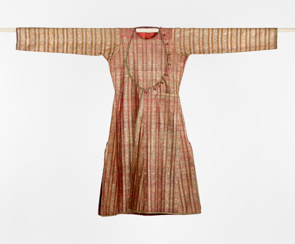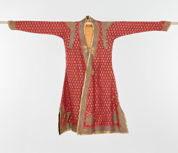 Lavish textiles played an important role in the palace life and the court ceremonies of the Islamic world. Palace interiors were filled with shimmering silks, colorfully embroidered cottons, and intricately patterned weavings. In Mughal India, the most spectacular fabrics were reserved for the emperor's coats (jamas) and sashes (patkas). Mughal emperors took special care to coordinate their ensembles, as is evidenced in miniature paintings that depict the emperor resplendent in his harmoniously colored garments and jewels. This type of arrangement may be appreciated in the Portrait of Emperor Jahangir (acc. no 81.230), an early seventeenth-century representation of the emperor dressed for court, but few actual garments or textiles survive from this time period. The coats and sashes in the Museum's collection give an idea of the opulence that characterized the Mughal courts of India, although they postdate the peak of Mughal political power.