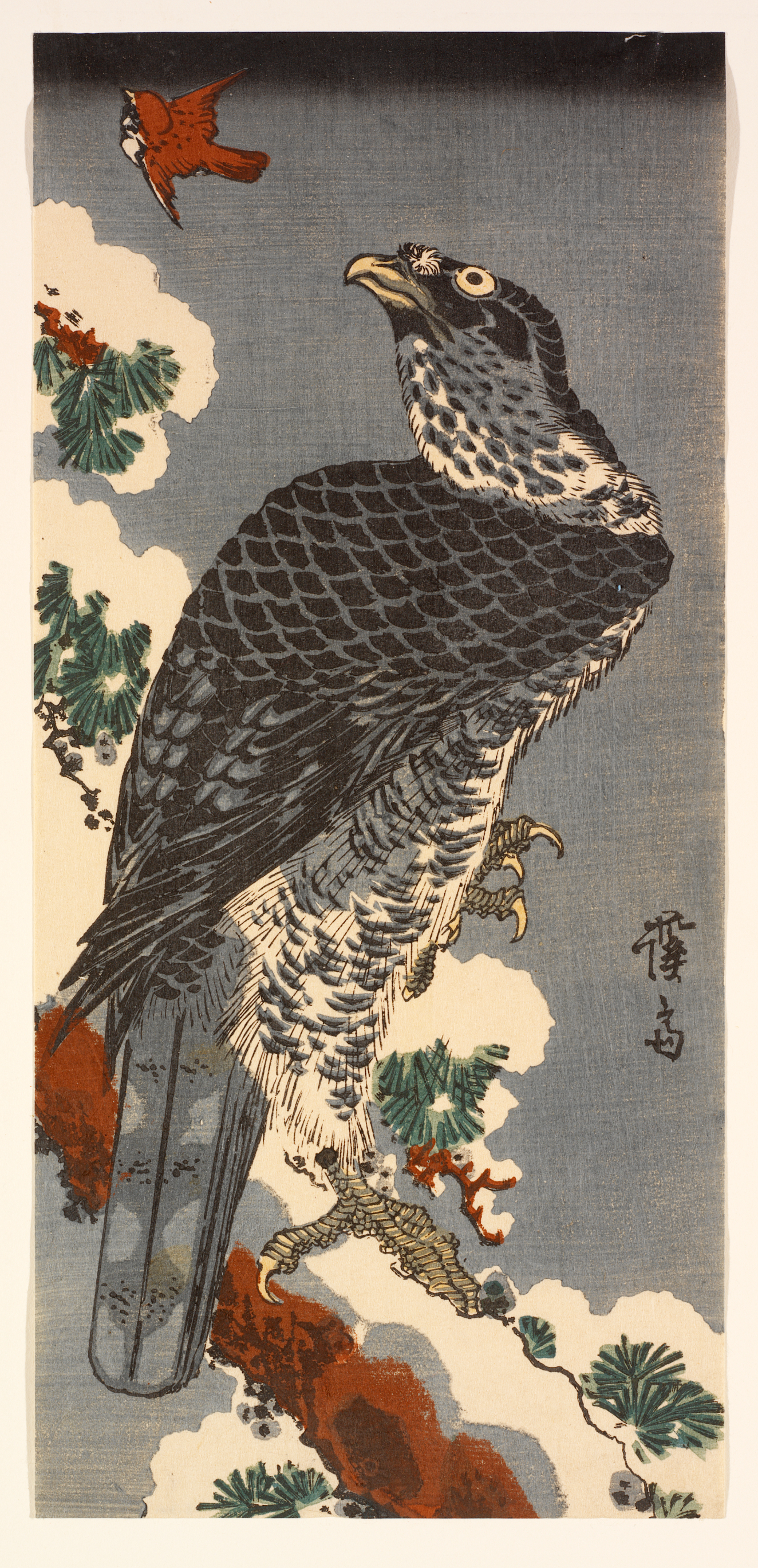 Falcon on snow-laden pine eyeing sparrow (Yukimatsu ni taka to suzume), Edo (Japanese period)