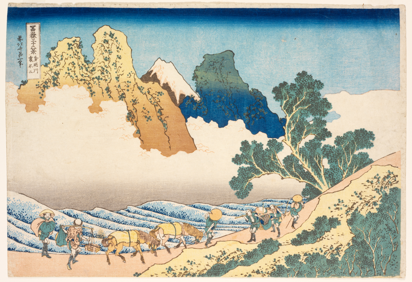 The specific order and dates of these prints are not known, but the geographic or narrative sequence of scenes seems to be of secondary importance compared to the true subject: the constant presence and transcendent nature of the lofty peak in all manner of viewpoints. The prints on display have been grouped into four compositional types: Mt. Fuji framed by the forces of nature, panoramic views of man, Fuji as a background host to travelers moving horizontally across the landscape, and Mt. Fuji as a distant entity peeking behind large foreground images of characters earning a living. At times, the famous peak is hardly recognizable (as in Mt. Fuji Behind Minobu River 18.1184) or not depicted at all (as in Pilgrims at the Summit of Mt. Fuji 20.1187). The peak might be viewed straight on (as in Fine Wind, Clear Evening 20.1185), from high above (as in Mt. Fuji From teh Tea Plantation of Katakura in Suruga Province 20.1181), or from near ground level (and even through a wooden tub, as in Fujimigahara in Owari Province 20.1182). The changes in perspective alter the pitch and volume of the sounds echoing across the landscape. The concern for geometry in compositional design result in subjects depicted with a vivid, fresh clarity. Finally, Hokusai's detailed descriptions of human activity, rarely captured in pictures before, create an impression of a vibrant countryside.