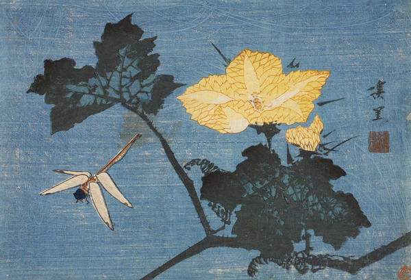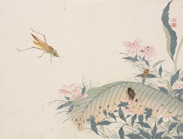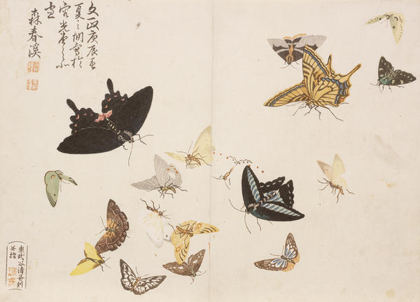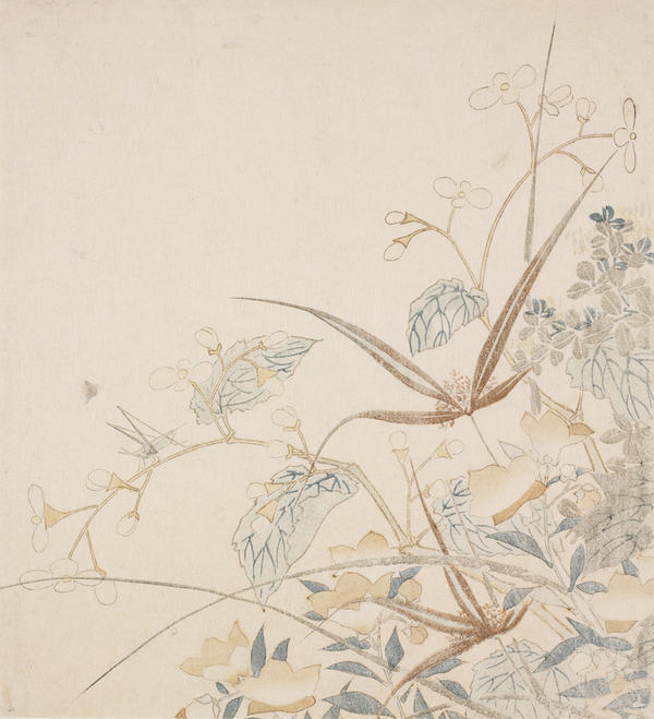 The stylistic treatment of grasses and insects in this group of early nineteenth-century prints mirrors artistic influences of eighteenth-century painting. The prints by Shunkei (fl. 1840s), an Osaka artist and pupil of Mori Sosen (1747-1821), reflect his teacher's preference for rendering realistic surface description. The ehon or picture book prints balance a finely textured, decorative surface (as seen in the use of mica dust for butterfly wings) with close attention to descriptive surface textures and linear details that verge on scientific observation or illustration.