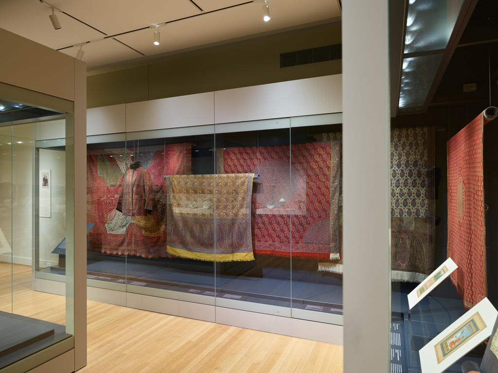 Some scholars theorize that the boteh developed in ancient Near Easten cultures from a wing or leaf form, evolving into a cypress tree or tree of life. Others track its beginning to the image of a single flower flanked by leaves, established in Persian art by the 1600s and soon after blossoming in textiles produced in northern India under the patronage of Mughal emperors. In this display, the evolution of the design is shown in Indian pieces spanning 200 years. Whether originating in leaf or flower, the boteh became more elaborate as it crossed cultures.