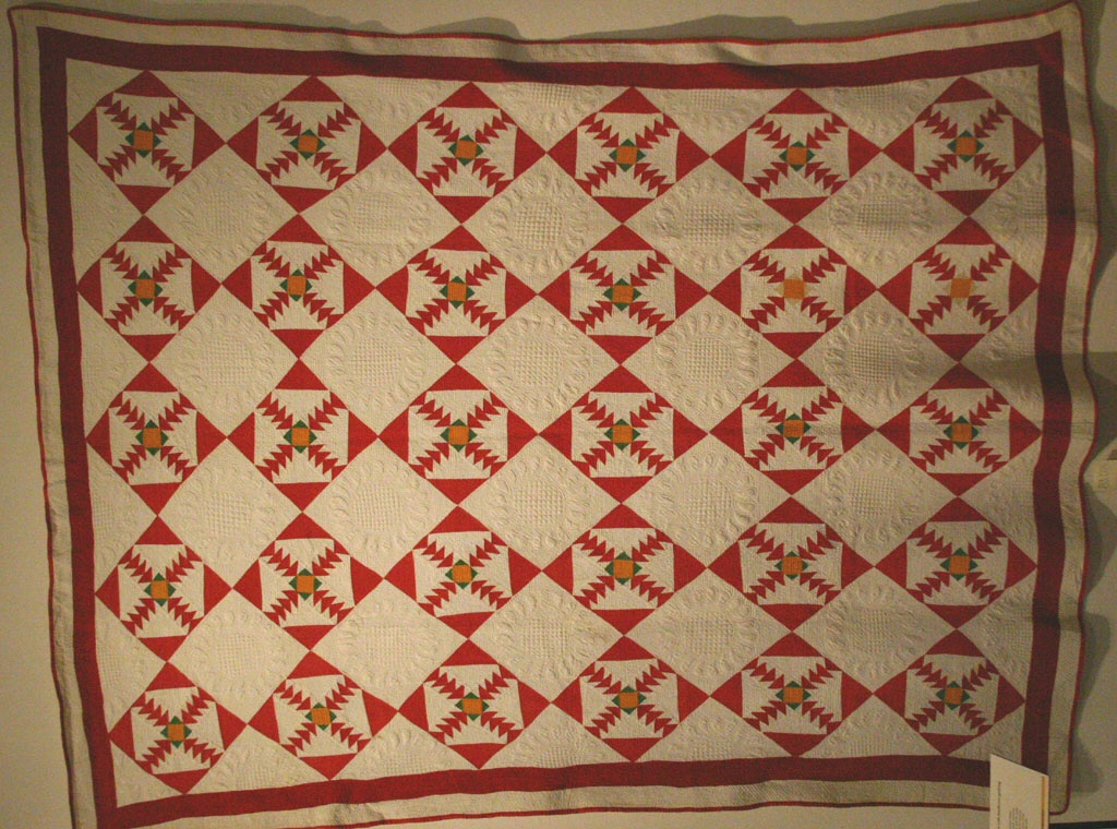 Since the 1970s, it has been fashionable to look at certain kinds of quilt patterns as anticipating a number of movements in 20th century art: abstract expressionism, op art, color field. Quilts, however, are textural objects that break through the two-dimensional picture plane prized in some modern painting. The tactile nature of the fabrics creates an intimate art form, inviting close inspection of details as well as appreciation of overall composition from a distance.