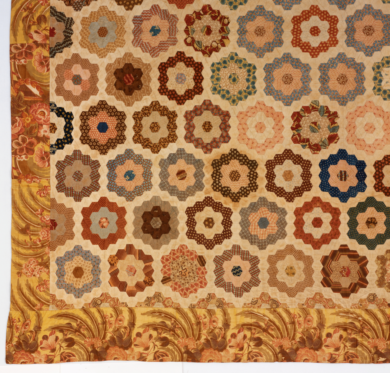 In choosing the pieces for this exhibition, the curators held to this guiding principle: condition problems do not reverse themselves in storage. Thus, when beautiful pieces show irreversible flaws that have emerged from use or "inherent vice," it was decided to allow them one last moment in the limelight, suitably supported, before nature continues to take its course. Quilts reflect the varied environments in which they were made and employed. The fabrics used in the quilts were originally finished for the dress or furnishing market with processes that have contributed to "inherent vice" in the cloth. In cottons, black and brown dyes that used iron sulfates and tannins as mordants (chemicals used to make fibers retain dyes) degrade the fibers over time. Similarly, metallic salts added to silk dyes to increase the fabric's weight react chemically with the fibers, causing the fabric to split and shred as it ages. Starching discolors cottons, and bleaching oxidizes and weakens fibers. When in use, the finished quilt suffers from the play of sunlight over its surface, as light fades the dyes. An admiring touch contributes damaging oils to the fabric. Variations in humidity and temperature cause fibers to lose strength and flexibility. Dust and food spills attract insects that harm the fabric, and laundering itself, while removing soil, abrades the fibers and also fades the dyes. Relegated to the presumed safety of a cedar chest, the quilt suffers from lack of ventilation, the presence of insects or molds, and brown staining due to contact with acids from ageing wood and paper wrappings.