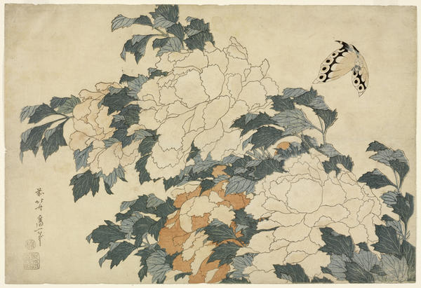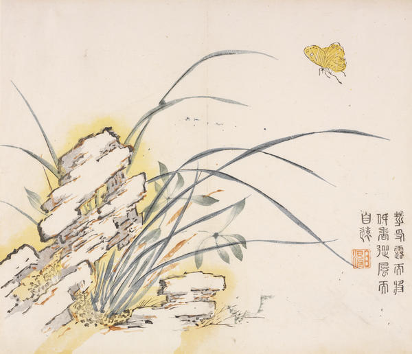 The portrayal of insects and flowers in prints is closely related to the bird-and-flower genre (kacho-e) which follows on from a well-established tradition in Chinese painting. While Chinese printmaking also influenced the development of this medium in Japan, Chinese prints of insects and flowers (such as the 17th century example to the right of this label) served a fundamentally different purpose from their Japanese counterparts. The Chinese examples were included in artistic manuals as models for aspiring painters while in Japan they were produced and enjoyed for their own sake.
