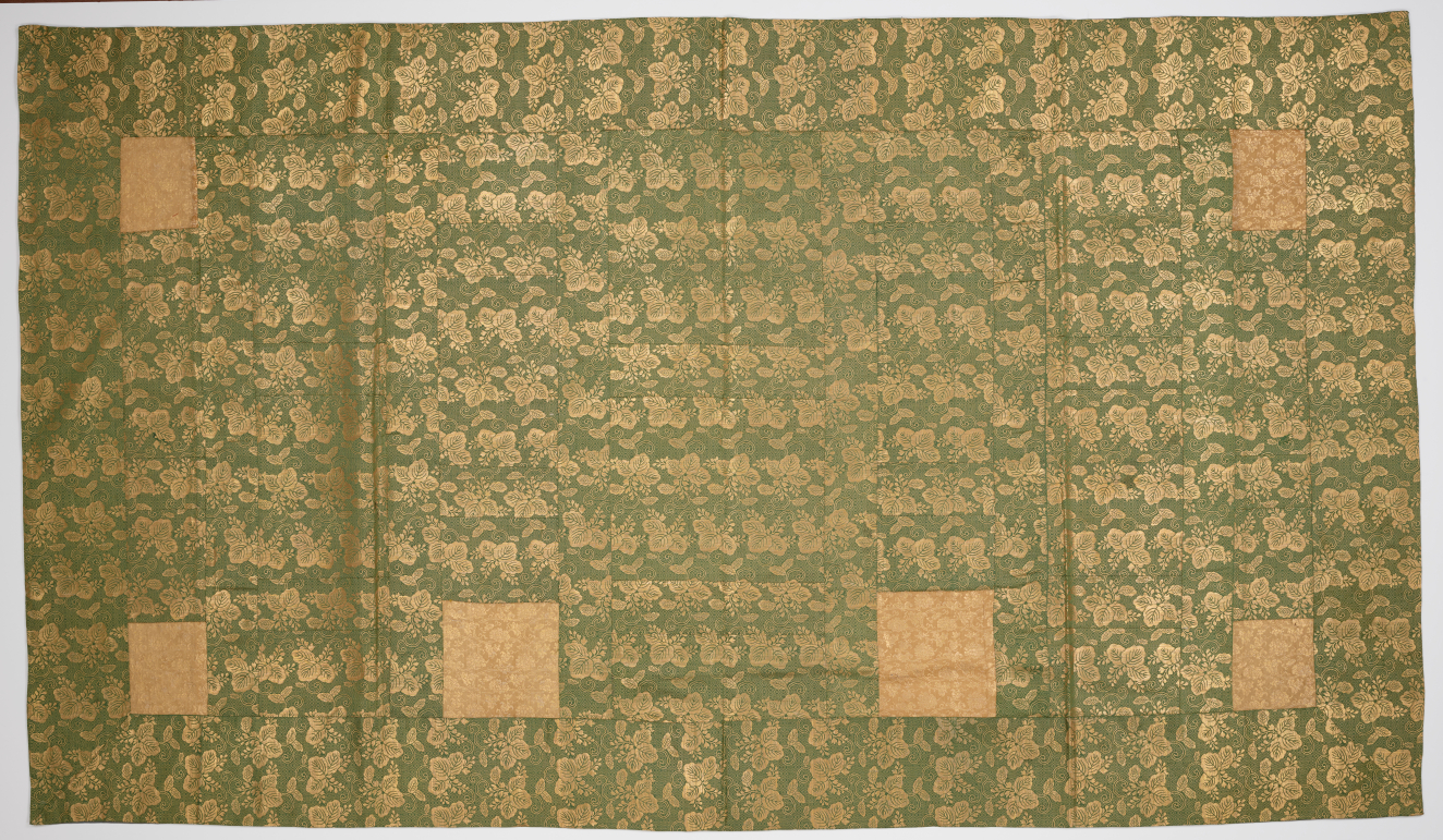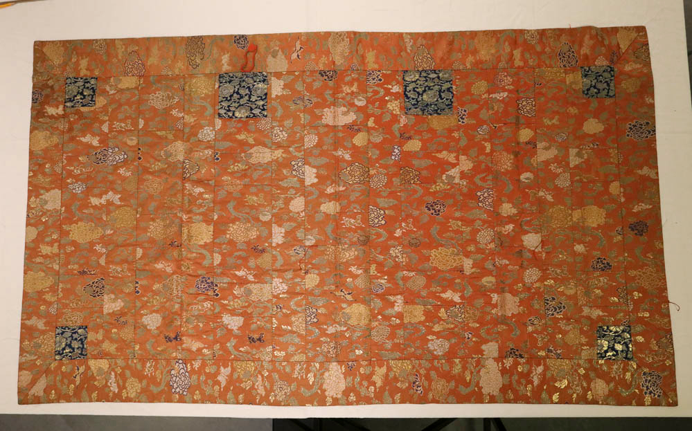 Instead of reusing coarse scraps of cast-off fabric, kesas from this period are frequently made from the sumptuous brocades produced by the silk looms that had been set up in the Nishijin sector of Kyoto by the Shogun Toyotomi Hideyoshi (1536-1598). There, many new techniques brought to Japan by weavers fleeing the chaos that surrounded the sinking fortunes of the Ming dynasty (1368-1644) in China were incorporated, such as the method of making gold-paper thread. Though these later kesas utilize extremely expensive fabrics, they sitll preserve the original patchwork effect. Morever, they also reflect the persistent belief in the efficacy of adaptive reuse of fabrics in a spiritual context. Sources for this silk brocade included Noh theater costumes, ceremonial court robes, and kimonos donatead or bequeathed to temples by devout women in search of religious merit. Thus beneath the highly luxurious surfaces of these RISD kesas lies a complex layer of symbolism reflecting an attitude towards the pious use of fabric that can ultimately be traced back to the original Buddhist distaste for the trappings of the material world. Here, sumptuous brocade carries a message of poverty with a heavy sense of irony.
