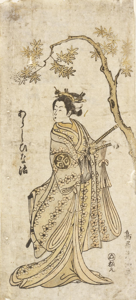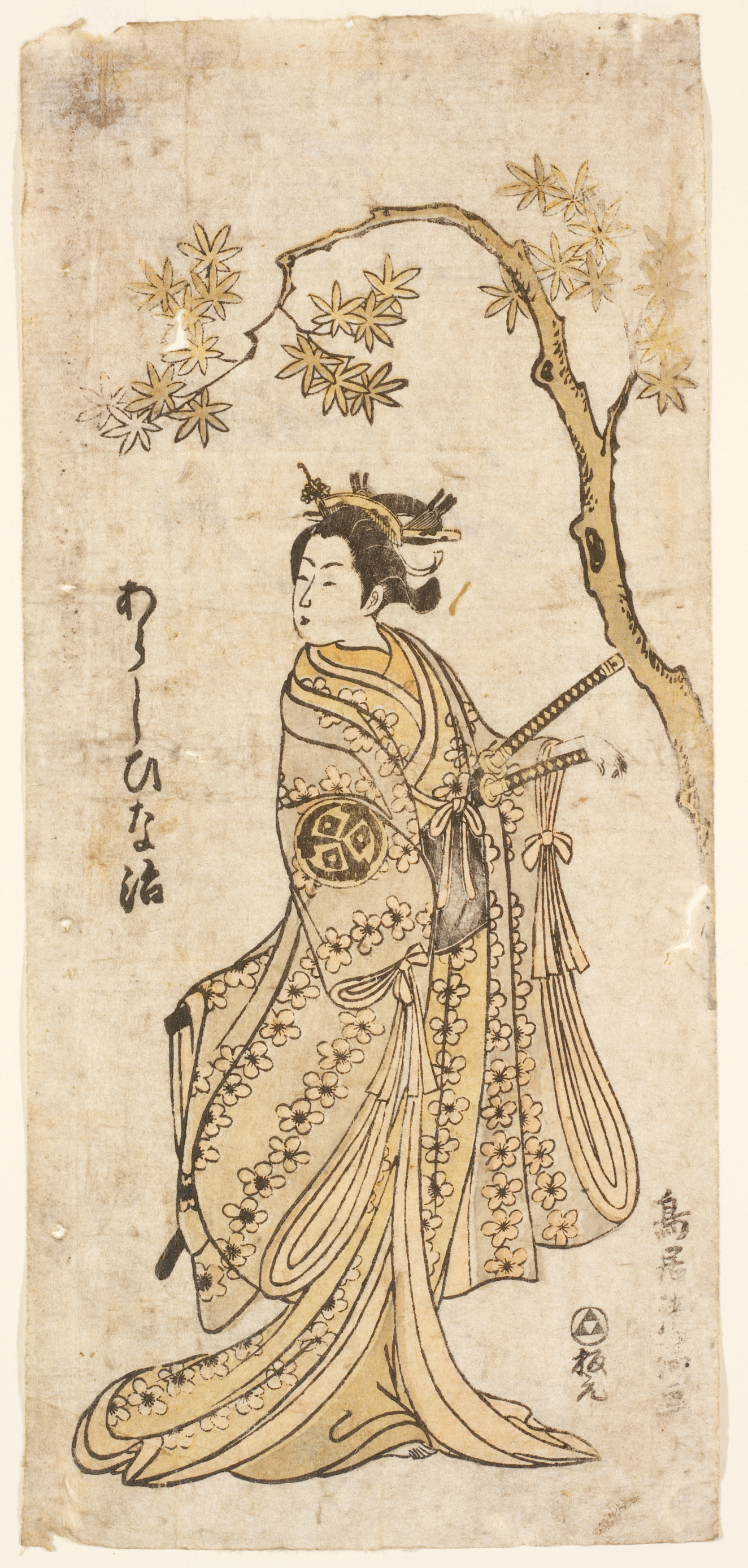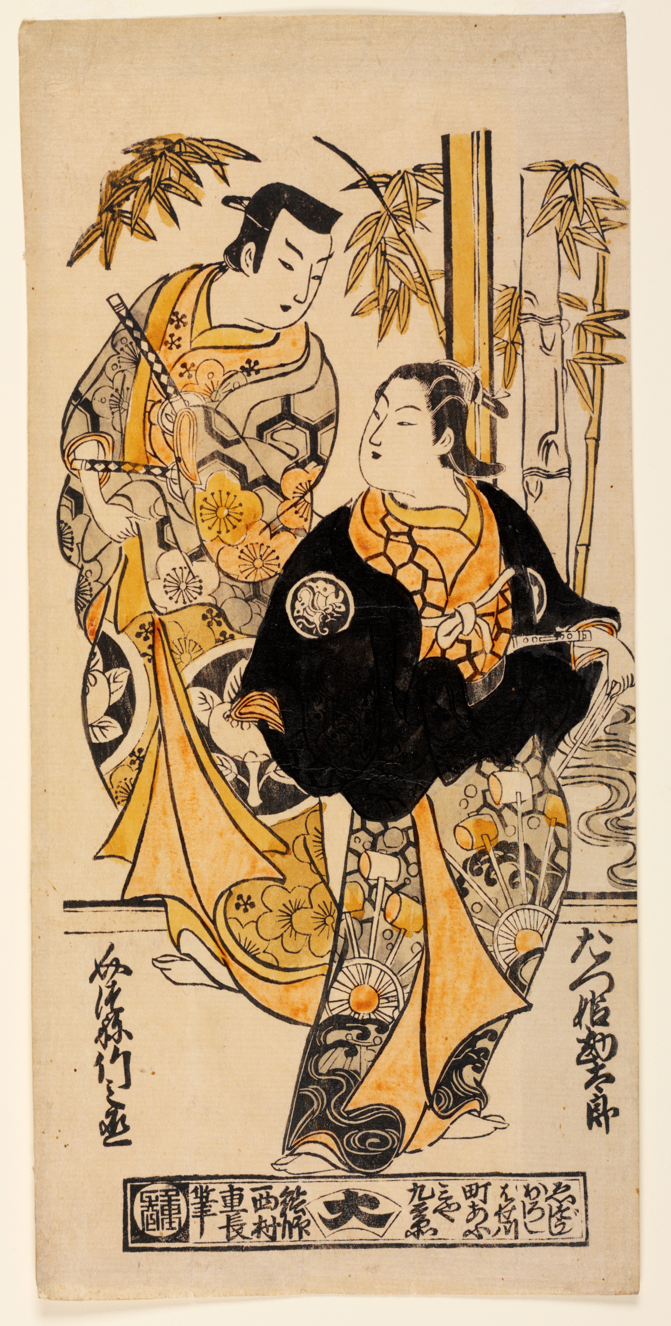 Nishimura Shigenaga The actors Ichimura Takenojo as Kudo Suketsune and Sanjo Kantaro as the princess Tatsuhime in the play Hinazuru unagasu Soga performed at the Ichimura Theatre 1722.11, Edo (Japanese period)