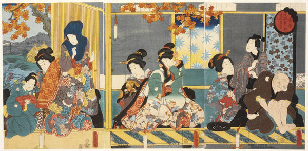 The subject of the twelve months was first introduced into the Japanese print repertory in the 18th century by Okumura Masanobu (1686-1764), a highly innovative Japanese printmaker. In contrast to mainstream depictions of kabuki actors and courtesans boldly framed against a simple ground, this new type of work encompassed scenery as well. A century later, Kunisada carried on the seasonal theme, but expanded the traditional triptych format, which featured one figure per panel, by adding additional figures to some panels and by overlapping foreground and background details between panels. Whether set within elaborate domestic interiors or a landscape environment, Kunisada’s monumental compositions are often more unified and dynamic than those of his predecessors.
