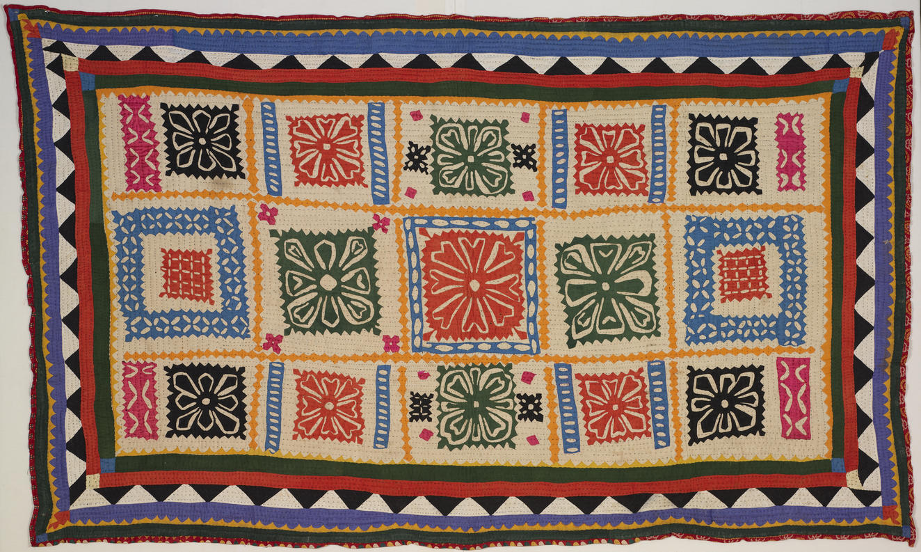 This group of quilts, newly aquired for the RISD Museum collection, is compelling for its history of ownership, its remote origins, and its representation of regional traditions. The quilts were initially purchased by Anjali Mangaldas, who was born into an Indian textile family and studied textile design in England and the United States. In 1962, after returning to India from her studies abroad, she traveled to the Kutch region of northwest India, where she met with individual craftspeople and purchased quilts and textiles that captivated her interest, as well as those that might inform her own textile work.