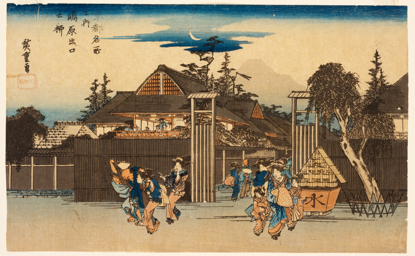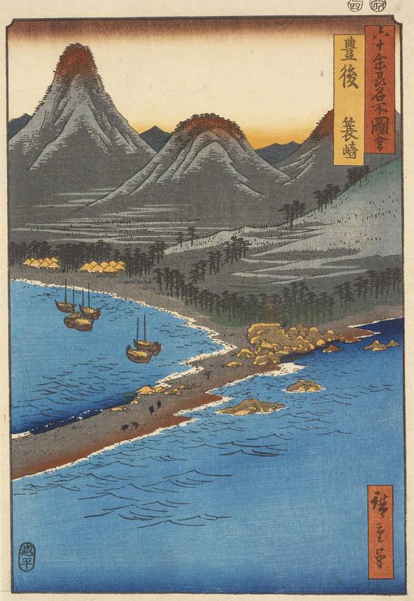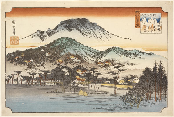 Meisho, or famous places, derive their significance from Japanese literary and religious associations described in the form of highly conventionalized poetic attributes. Sites of this type, originally located in the vicinity of the ancient capitals of Kyoto and Nara, were painted as early as the Heian period (794-1185). By the Edo period (1600-1868), however, the term meisho in popular culture had come to refer to sites that could be visited for relaxation and pleasure. In teh early nineteenth century, landscapes and cityscapes that depicted such places became an important part of the woodblock printing (ukiyo-e) tradition. Although Hokusai (1760-1849) was one of the first great practitioners of this art, it is Hiroshige's (1797-1858) extensive and innovative creations that characterize the genre. This exhibition of Hiroshige's evocative and mood-filled views is composed of selections from several of his well-known city and landscape series, as well as the complete set of Eight Views of Lake Biwa.