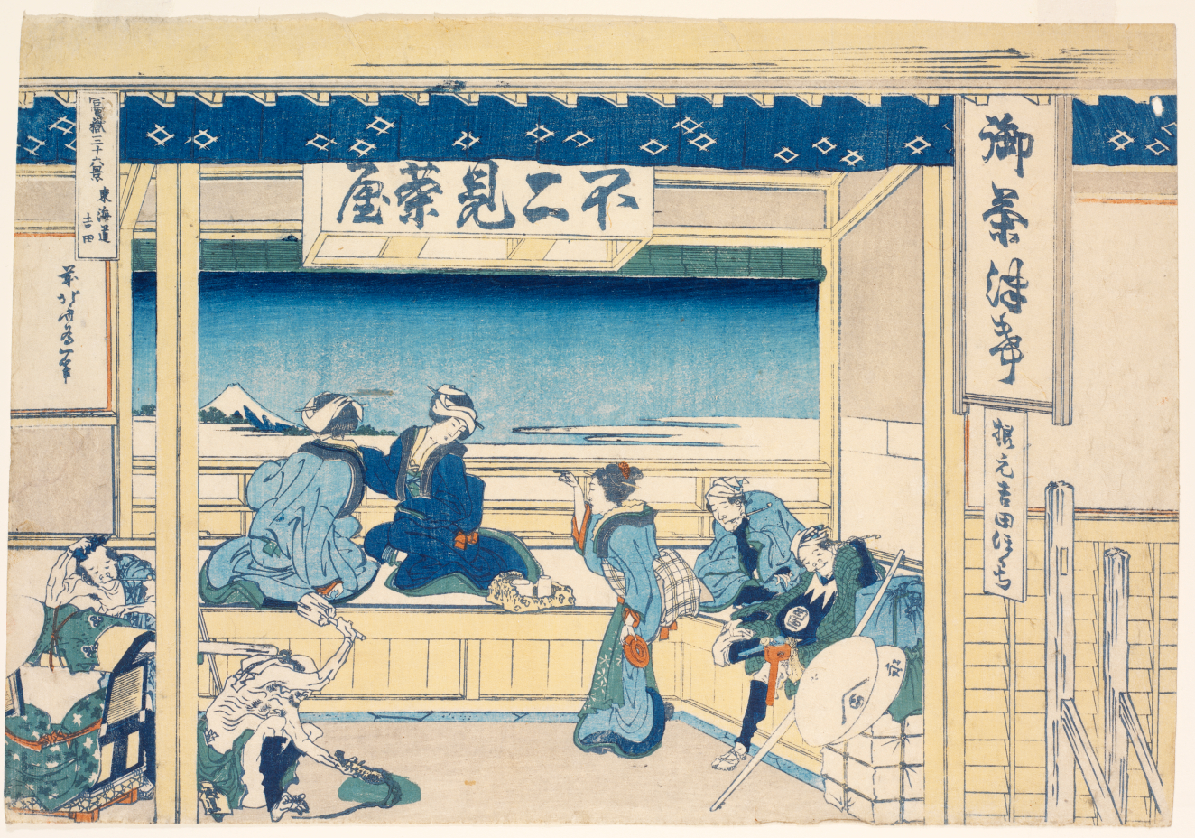 Two great printmakers are associated with the rising landscape genre: Katsushika Hokusai (1760-1849) and Utagawa Hiroshige (1797-1858). Hokusai’s Thirty-Six Views of Mt. Fuji (actually 46 in number) was the groundbreaking series (ca. 1829-33). The Japanese have always regarded Mt. Fuji as most sacred. This volcanic mountain with its characteristic conical form is still classified as active. Hiroshige’s Fifty-Three Stations of the Tokaido followed in about 1833-34. The Tokaido (Eastern Sea Route) connected Edo (modern Tokyo), the seat of the shogun (military dictator) with the ancient capital of Kyoto, where the emperor continued to reside. Tradition has it that Hiroshige traveled the Tokaido in 1832 with the delegation bringing the shogun’s annual spring tribute to the emperor.