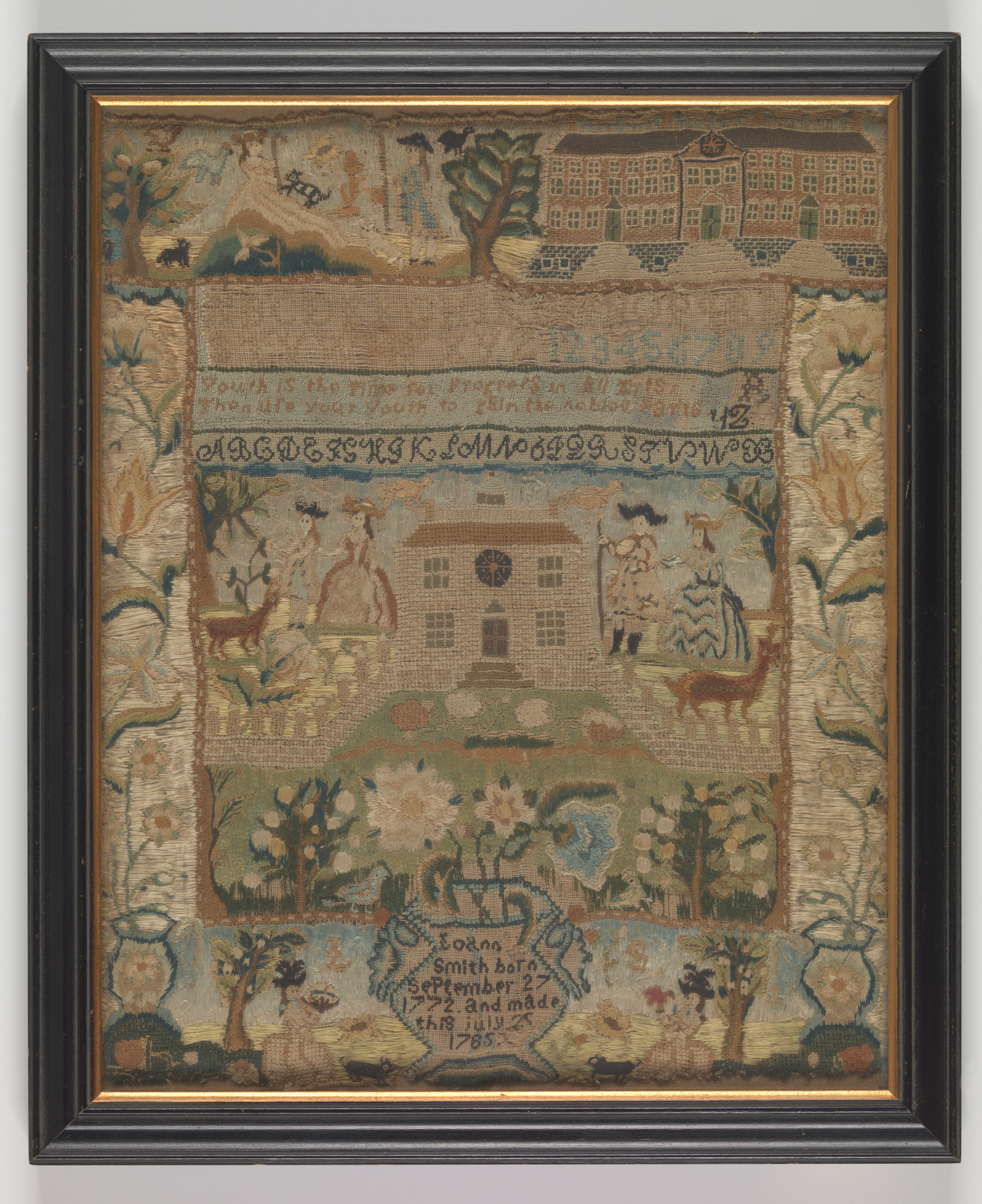 Colonial embroidery is characterized by the use of a minimum of solidly filled forms in order to save the needlewoman precious time and thread. However, what the work loses in detail and intricacy is often gained in strength and inventiveness. Though colonial and European embroidery differ in this respect, both share the eigtheenth century's love of floral and acanthus leaf motifs distributed along meandering, curved lines. The relationship of the embroidered design to the piece itself varied. Some women concentrated on borders which followed and emphasized the perimeters of their work, while others like Elizabeth Reed, used an overall distribution of pattern on a coverlet reminiscent of tapestries or chintz. Because most coverlets were woven in two breadths, then sewn together, and alternative approach which acknowledges the center seam can be found in both Sarah Packard Snell's and Rebekah Dickinson's bisymmetrical designs.