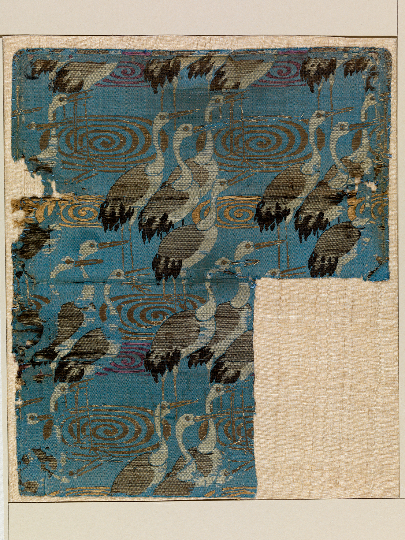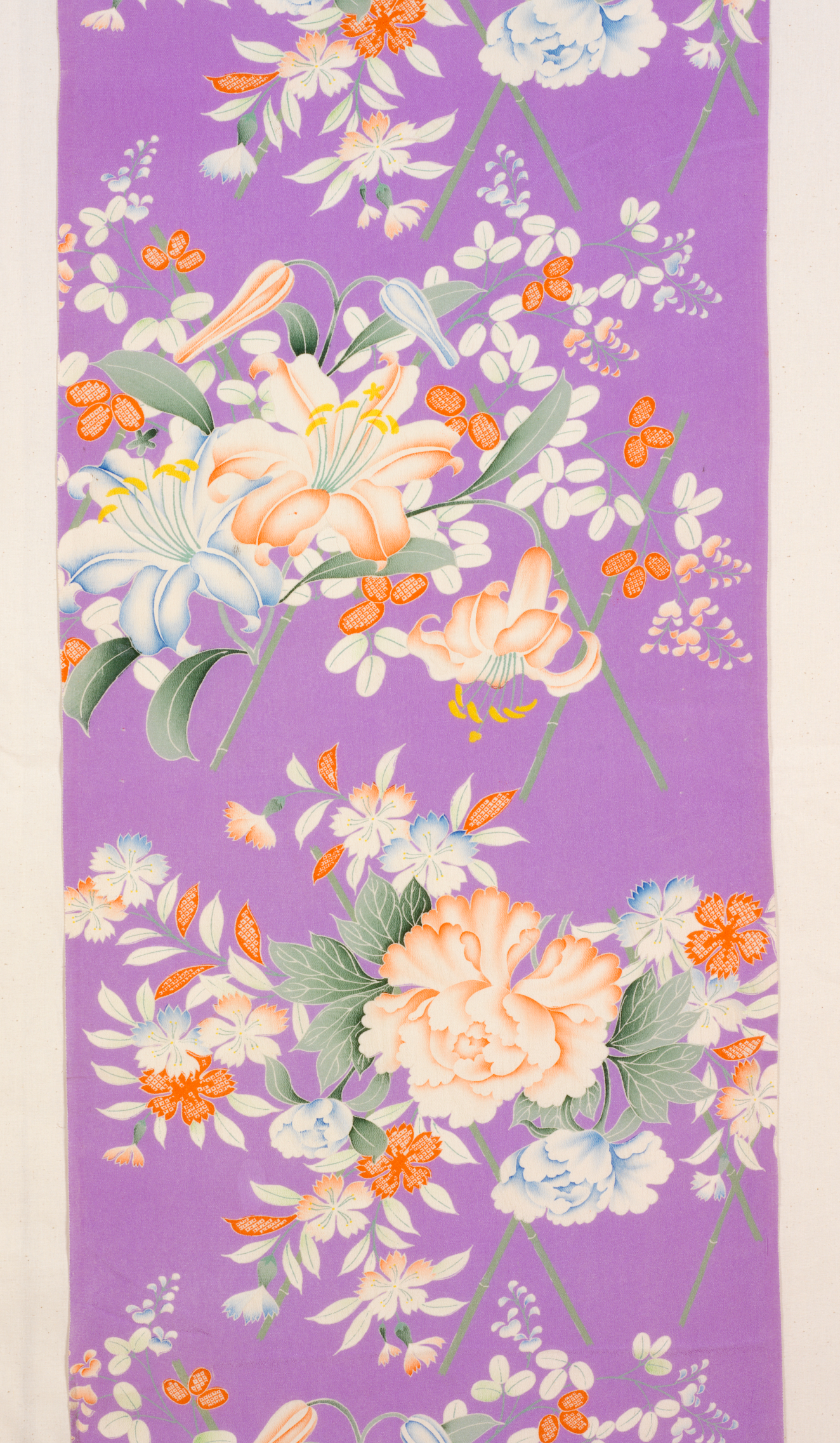 Bird-and-flower imagery is part of a long and evolving design tradition in Japan. The Japanese reverence for the natural world has its roots in ancient Chinese belief systems that mixed with the animism of Japan’s indigenous Shinto religion and the later influence of Buddhist practices from India and China. A vocabulary of literary and visual symbols based on observation of nature from an aesthetic standpoint came to the fore during the Heian period (794-1185). Birds and flowers became the most popular design motifs for cloth during the Muromachi (1338-1573) and Momoyama (1573-1603) periods and provided a rich and complex stock of motifs originating from Heian poetry and courtly traditions.