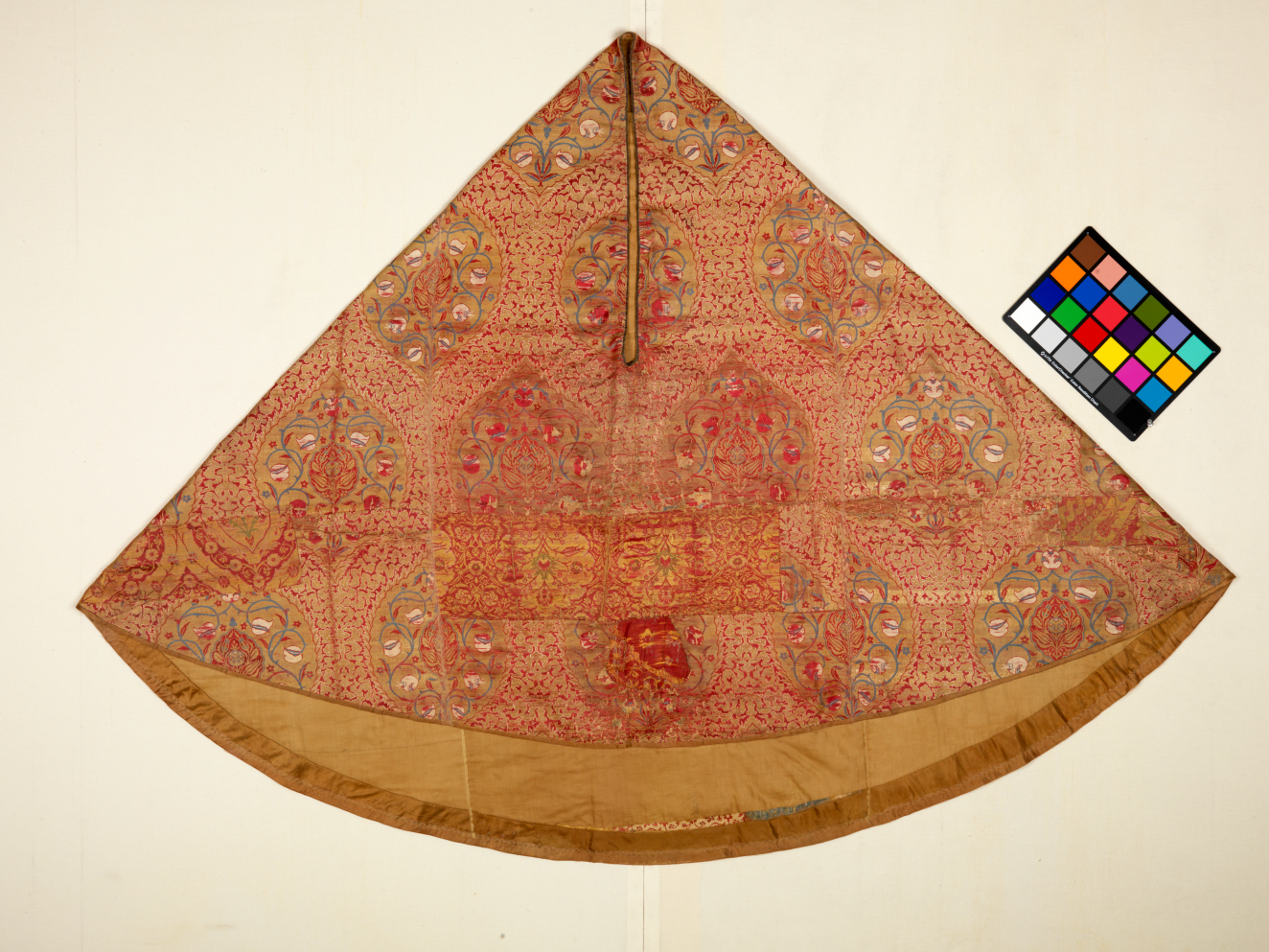 Rich and colorful textiles were among the glories of Ottoman art. The examples here represent several combinations of fibers, weaves, and kinds of decoration, ranging from the bold colors and large-scale pattern of an embroidered linen curtain, to the rich hues and luxurious texture of a velvet cushion cover, and the shimmering silver and gold threads of silk brocade.