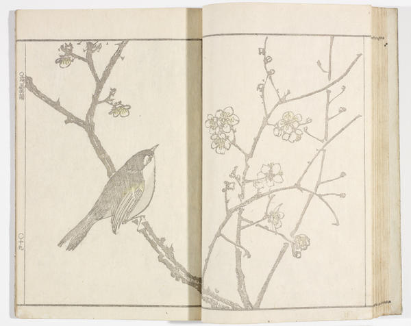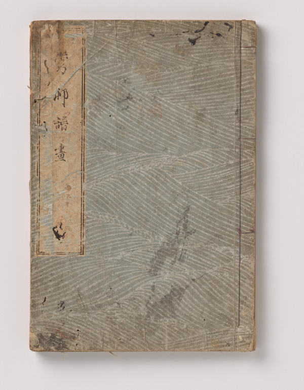The books exhibited in the central case complement the prints on the wall by illustrating how an artist’s designs were disseminated in book form. The earliest example, The Moving Brush in "Rough" Painting of 1748-49 by Morikuni (1679-1748), clearly shows how brush techniques were translated into the medium of print. Although it predates the other works in this exhibition, it is included here because its illustrations were some of the earliest to demonstrate the carryover of painting technique to woodblock printing. Other books in the case are picture albums (gafu), which circulated a painter’s or designer’s compositions widely in an inexpensive format.