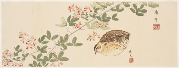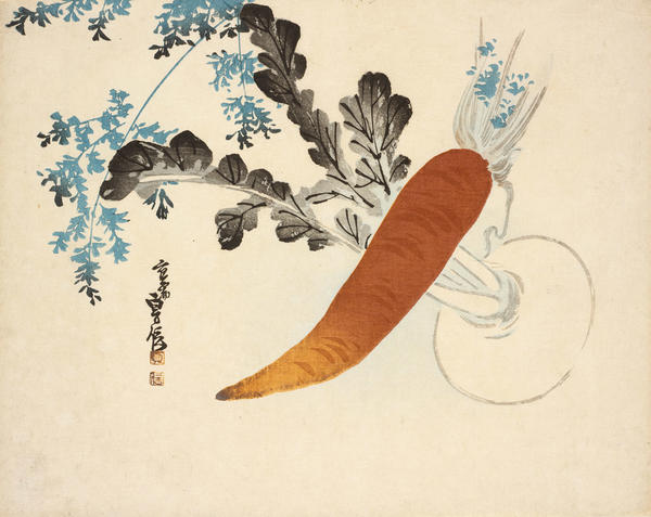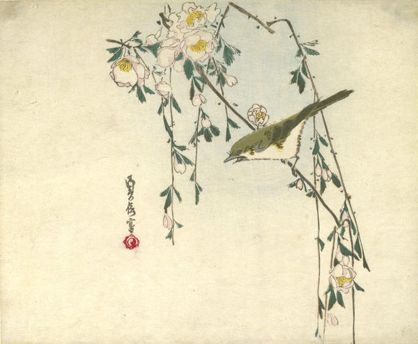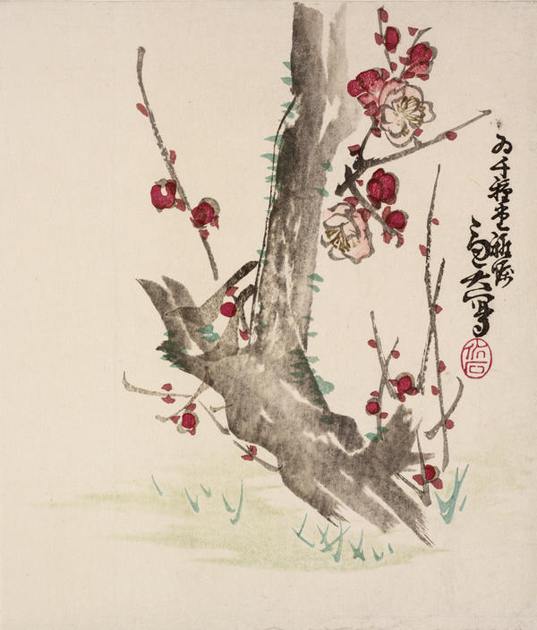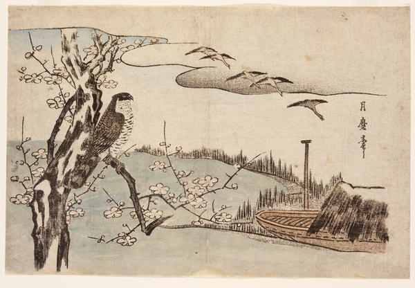 The woodcut technique is used here to convey the sense of a calligraphic brushstroke, and in most instances the forms are depicted without the black outlines so typical of ukiyo-e. This practice, seen in many of the works on view, simulates the “boneless” method of painting that originated in China in the 10th century and was imitated in Japan. These painterly prints often lack the rich overall patterns of color and form so characteristic of ukiyo-e works. Instead, the subject is depicted against a blank ground to create a sense of depth and spatial recession, utilizing a compositional approach borrowed from painting.