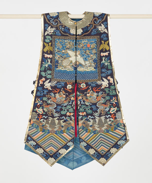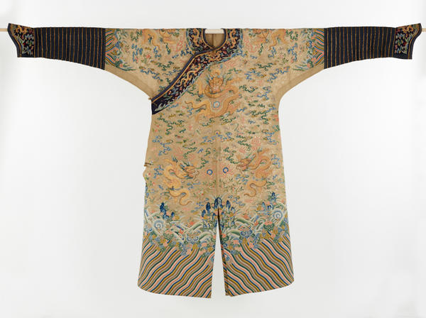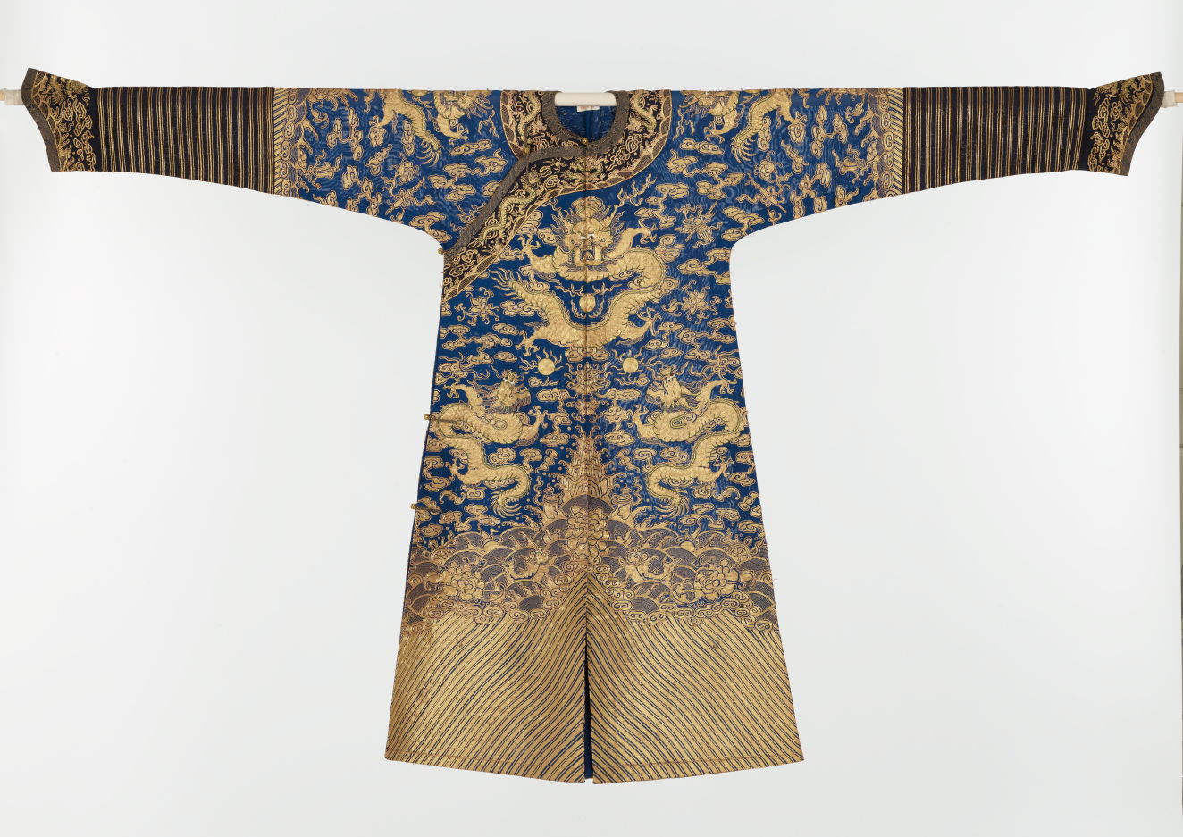 By the 19th century, when most of these robes were made, strict tradition had softened somewhat. Most officials now wore fiveclawed dragons, and many symbols had become merely decorative elements, but official robes still reflected the Confucian world with waves at bottom, the land mountain protruding from the waves, a cloudy sky, and dragons to represent the Emperor, the center of the universe.