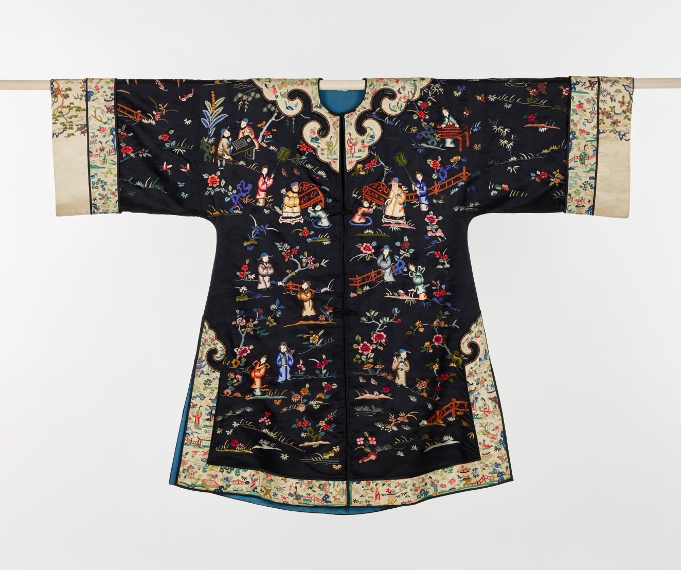 By the 19th century, when most of these robes were made, strict tradition had softened somewhat. Most officials now wore five­clawed dragons, and many symbols had become merely decorative elements, but official robes still reflected the Confucian world with waves at bottom, the land mountain protruding from the waves, a cloudy sky, and dragons to represent the Emperor, the center of the universe.
