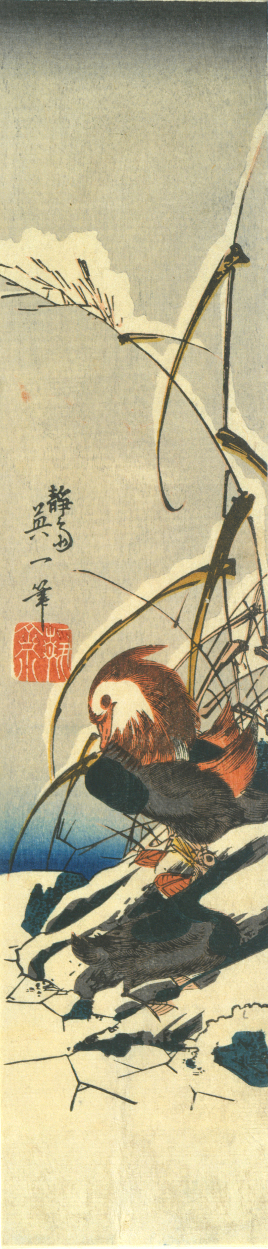 Strength and fortitude are the prime associations that come to mind in looking at these prints of snow-laden tree branches and bamboo. The pines symbolize long life, and bamboo connotes modesty and flexibility because of its ability to bend and not break in the wind. Both remain green throughout the winter, enduring the harshness of the weather and recalling the promise of spring to come. Snow-covered branches of camellia (tsubaki), which bloom during the winter and into early spring, convey the same promise; the plum tree blossoms in early spring, yet when shown with snow-covered branches, it too acts more as a herald for that season. Mandarin ducks, which evoke happiness in marriage because they mate for life, are also a standard winter motif.