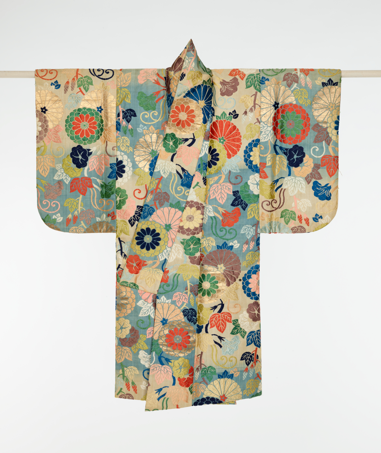 The robes on view include the kariginu ("hunting robe"), originally an informal jacket worn by Heian period (894-1185) men, and the atsuita ("thick-board") heavy weave robe used for male characters, as well as the karaori ("Chinese weave") kimono for female characters. In addition to the basic use of the robe to identify the sex of the character, the robe can have a wide range of meanings associated with its color or pattern. Usually, red in the karaori is used for young female roles, while karaori without red are used for elderly females. Bold designs with Genji wheels, dragons, clouds or thunder are reserved for male roles, and the triangular "fish-scale" pattern is used for demonic spirits or characters pushed to madness.