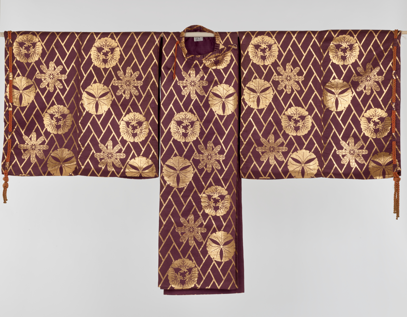 In the empty space of the Noh stage, a square space defined only by wooden pillars at each corner and a background painting of a grand pine tree, the Noh costume assumes a vital role in defining characters and establishing the mood of the scene. Shimmering against the bare, highly polished wooden floors, the golden robes of the costume indicate the character's sex, age or nature.