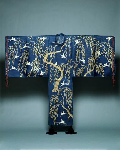 The robes on view include the kariginu ("hunting robe"), originally an informal jacket worn by Heian period (894-1185) men, and the atsuita ("thick-board") heavy weave robe used for male characters, as well as the karaori ("Chinese weave") kimono for female characters. In addition to the basic use of the robe to identify the sex of the character, the robe can have a wide range of meanings associated with its color or pattern. Usually, red in the karaori is used for young female roles, while karaori without red are used for elderly females. Bold designs with Genji wheels, dragons, clouds or thunder are reserved for male roles, and the triangular "fish-scale" pattern is used for demonic spirits or characters pushed to madness.