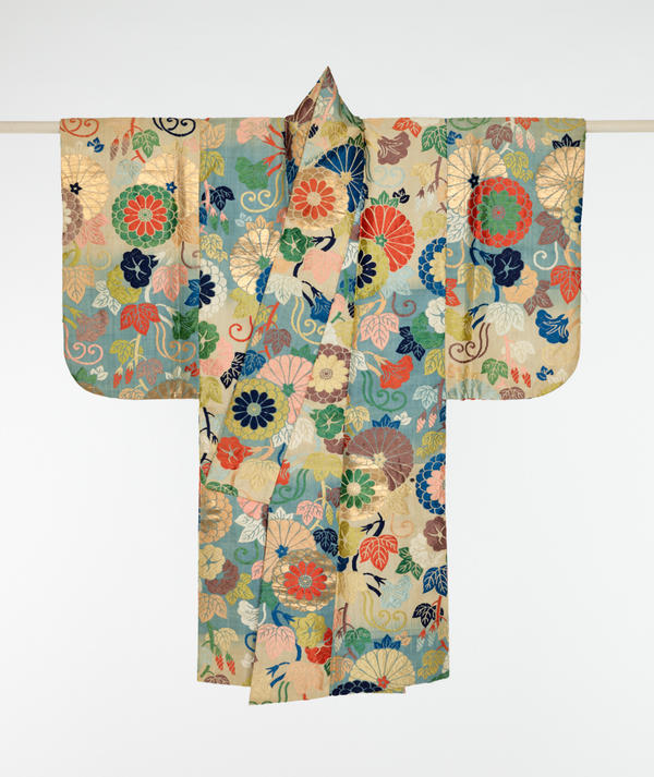 On another level, the colors and motifs reverberate with symbolic and poetic associations drawn from a rich literary tradition. The pairing of the patterns on view with poetry from such classics as the poetic anthologies Man'yoshu (The Ten Thousand Leaves, 8th century) and Kokin Wakashu (Collection of Early and Modern Japanese Poetry, ca. 905) or the eleventh century novel the Tale of Genji is meant to illuminate the poetic resonance of the motifs. From ancient times, imagery of the robe appears frequently in classical poems of love and emotion. Sleeves waving sad farewells, white-cloth sleeves that must pull apart as day approaches, and sleeves drenched in tears are sprinkled through the anthologies beside images of belts wrapped lovingly around a waist, or skirts associated with one's wife. In addition, looms and the act of weaving or sewing are important motifs used to convey feelings of the heart. By contrasting the act of careful weaving iwth the chaotic motion of scattering, the following poem heightens a sense of sadness for the evanescence of love and all things in life: