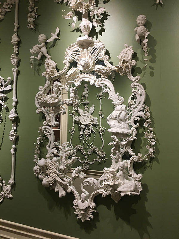 In this intervention, I shine a light on Pendleton’s inner life, embellishing liberally. In the corridor leading into the domestic sphere of Pendleton House, I’ve created a lavish porcelain room made from cast toys, figurines, corporate mascots, and other pop icons. The muse for Games of Chance is Fortuna, the Roman goddess of luck. A blindfolded Marilyn Monroe represents the goddess, who, with a spin of her wheel, conjures a shipwreck on one side of the room and paradise on the other.