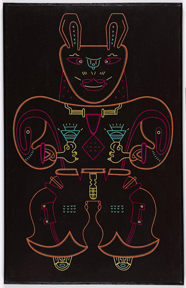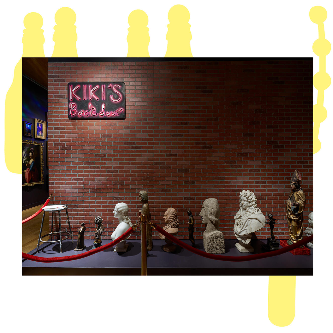 Inside Kiki’s Backdoor, works from the RISD Museum’s collection, ranging from medieval to contemporary, are arranged to draw attention to their humanity. These bold creatures stare at us with frank gazes: we cruise them and they cruise us. Party lights rake across the canvases, casting strips of blue, red, and green across the faces that line the walls of the club, bringing them all into the present moment with us. Out back behind the dumpster, sculptures wait in line to be let in.