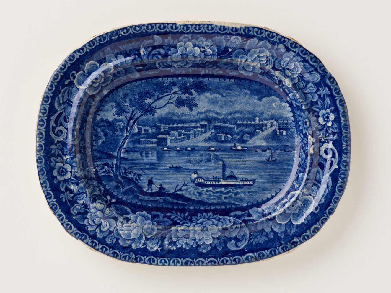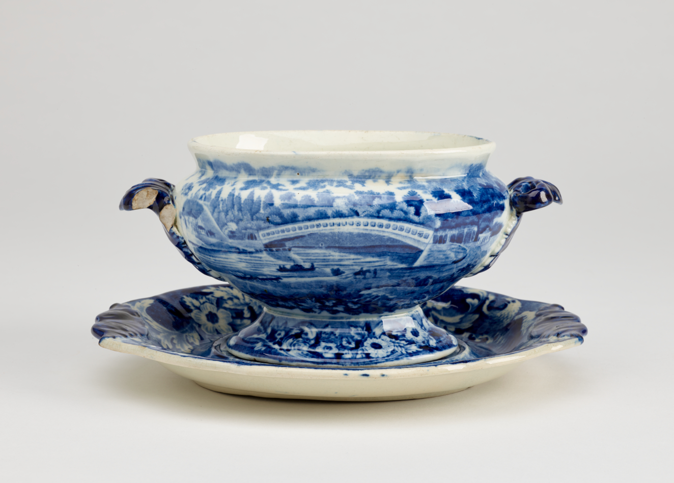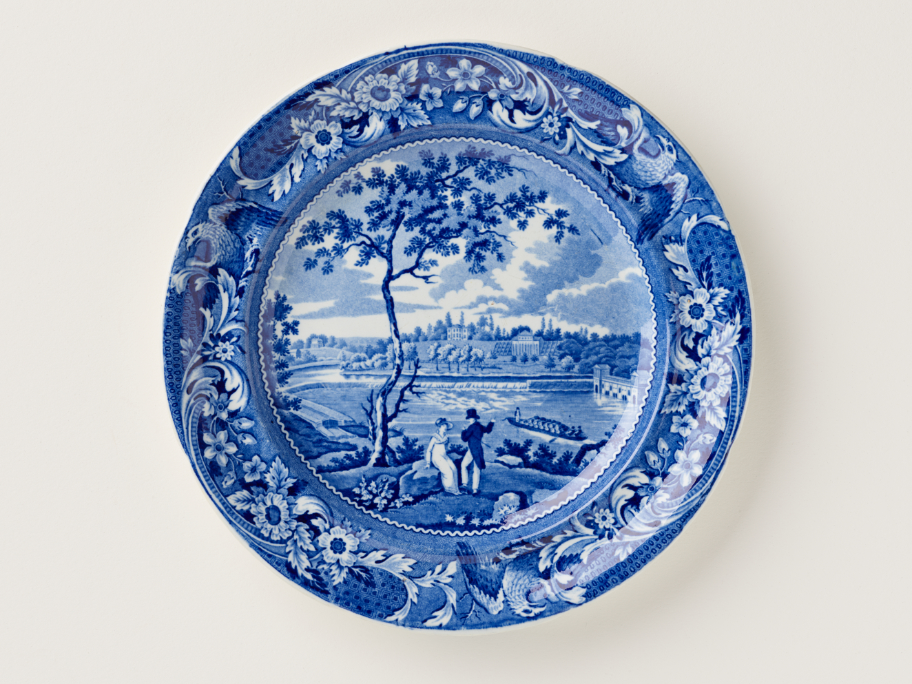 This installation juxtaposes early 19th-century Staffordshire ceramic transferwares drawn from the shelves of RISD Museum storage with new Cumbrian Blue(s) artworks. Replacing the porcelain works typically on view in this gallery, New American Scenery melds historic printed tablewares, altered antique ceramics, and reclaimed Syracuse China plates with new screenprints to update early transferware subjects for the 21st century.