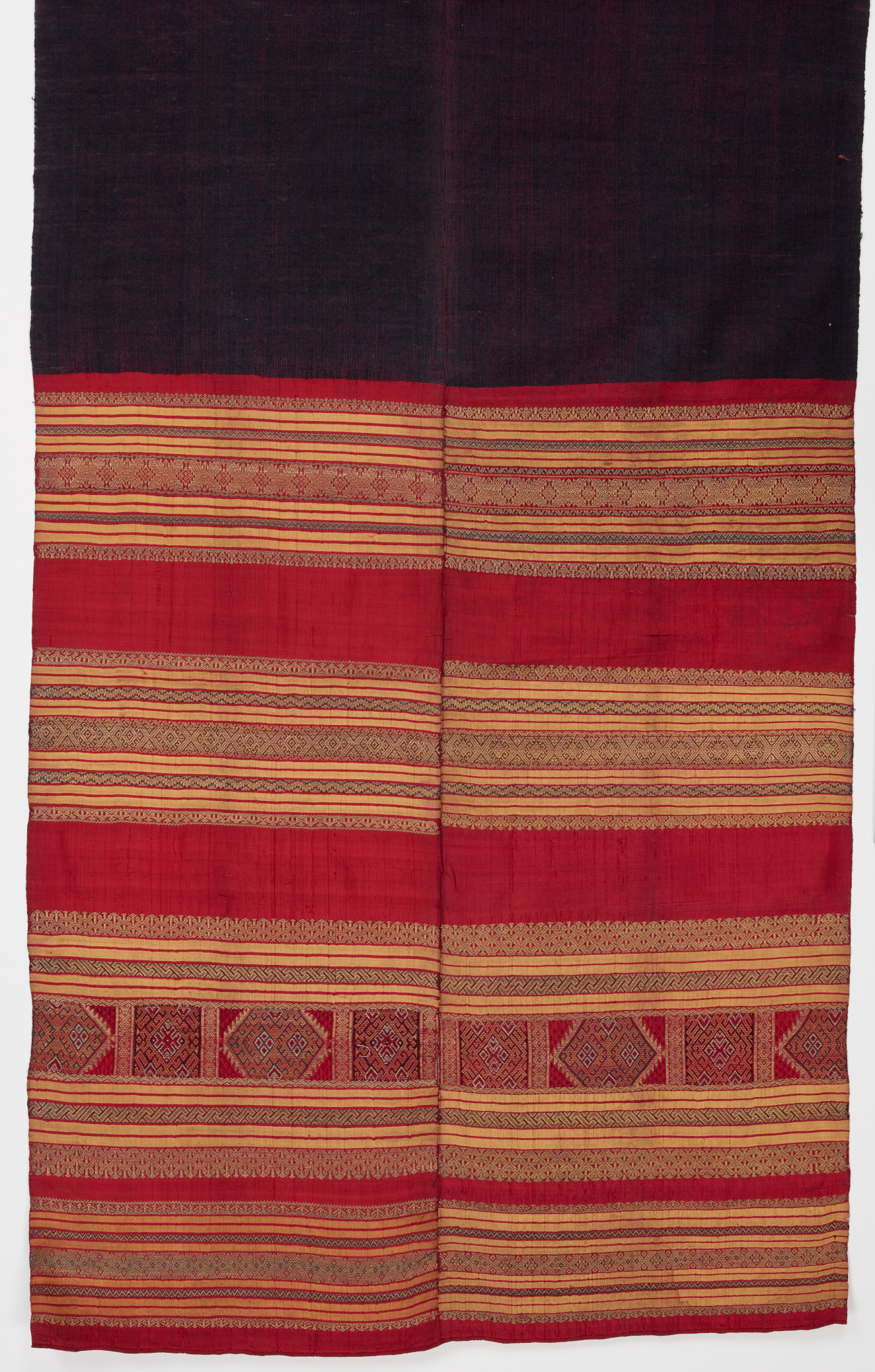 Kain is the general word for these textiles, often modified by the term songket, referring to the use of a supplemental weft. The Sumatran kain songket can take many forms, but are almost always untailored cloths intended to be wrapped around the body in a variety of ways, such as the sarong (a long skirt worn by both men and women), the slendang (a shawl wrapped loosely around the shoulders), and the ikat kepala (a head covering or turban). Today, the most elaborate sarongs are only used for ceremonial purposes, such as the complex exchange of gifts that accompanies marriage rituals. Most of the sarongs in this exhibition come from the southern region of Palembang, which is famous for its red silks, often featuring suble weft ikat backgrounds, with brocade in supplementary gold and silver weft yarns.