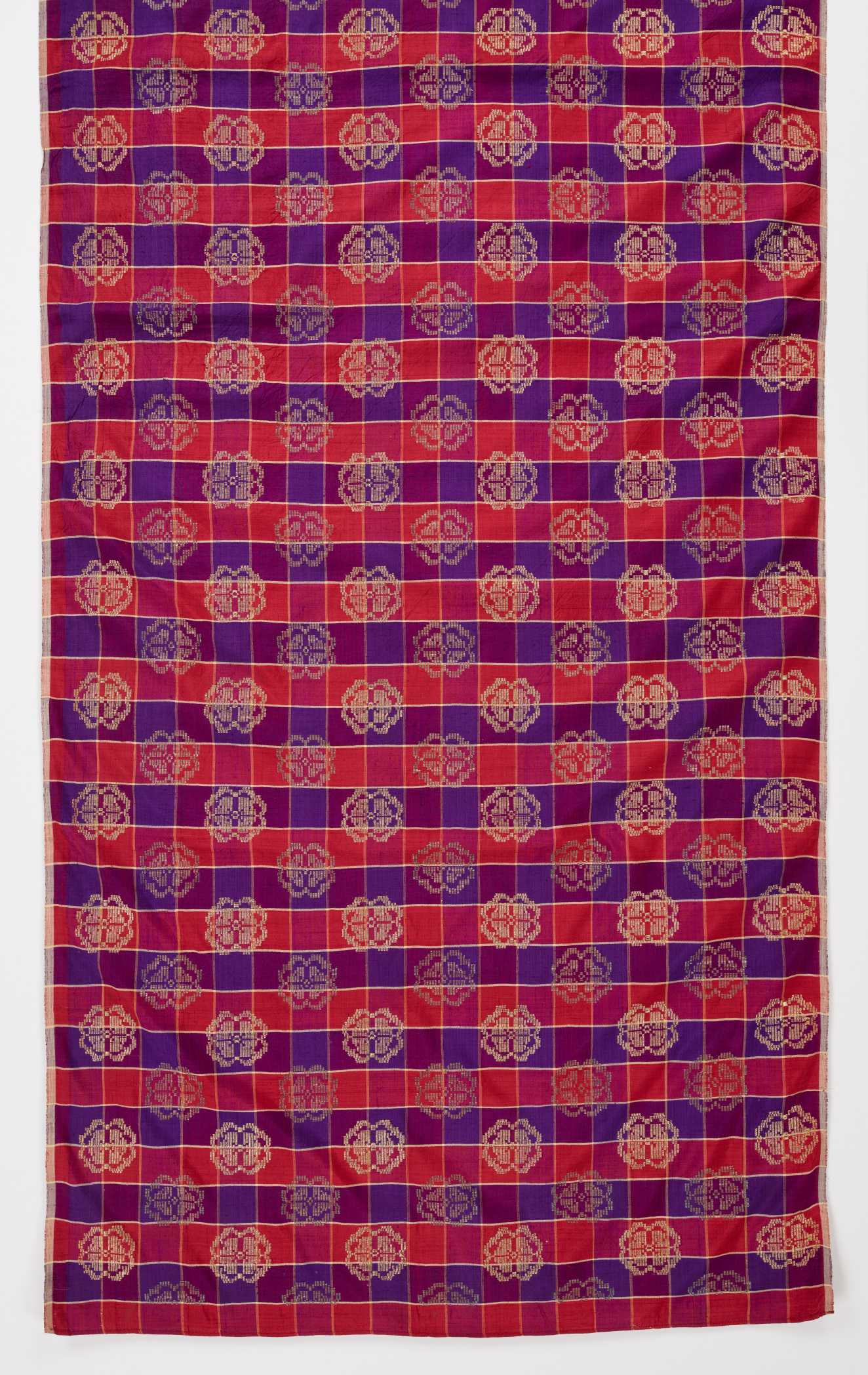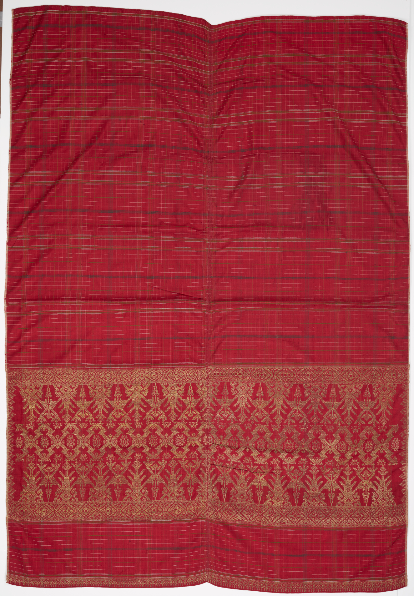 Kain is the general word for these textiles, often modified by the term songket, referring to the use of a supplemental weft. The Sumatran kain songket can take many forms, but are almost always untailored cloths intended to be wrapped around the body in a variety of ways, such as the sarong (a long skirt worn by both men and women), the slendang (a shawl wrapped loosely around the shoulders), and the ikat kepala (a head covering or turban). Today, the most elaborate sarongs are only used for ceremonial purposes, such as the complex exchange of gifts that accompanies marriage rituals. Most of the sarongs in this exhibition come from the southern region of Palembang, which is famous for its red silks, often featuring suble weft ikat backgrounds, with brocade in supplementary gold and silver weft yarns.
