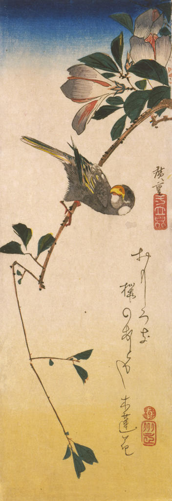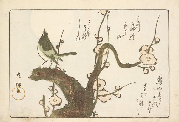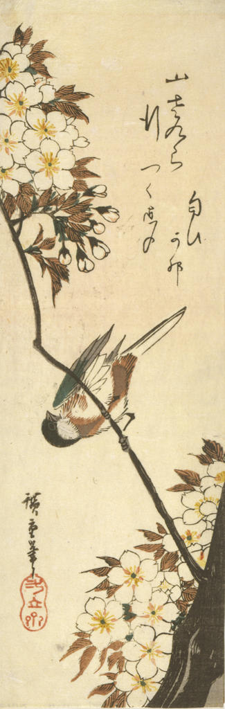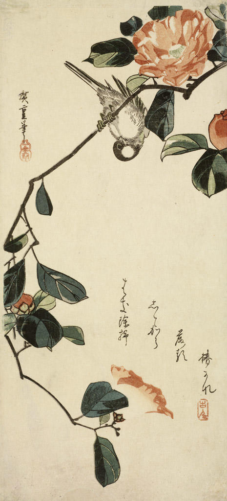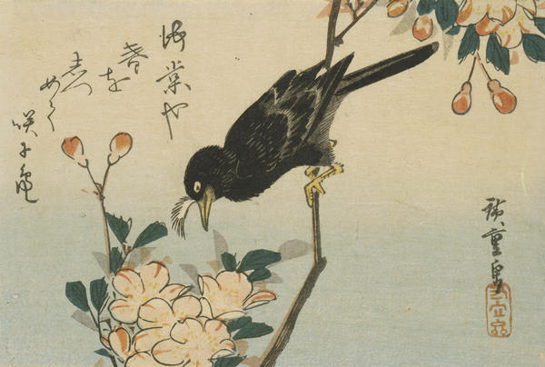 In the eighteenth and nineteenth centuries, the Japanese still used a lunar calendar in which the new year began in early to mid-February (in1999 the lunar new year began on February 16). The first three months of this calendar were designated as spring, thus the weather depicted in some of the prints on view is more wintry than might be expected for "spring" in the united States. In Japan, the flowers most closely identified with this season are the plum (ume), certain varieties of camellia (tsubaki), the peach (momo), and most of all, the cherry (sakura). The plum and camellias usually blossom at the beginning of the new year and so are traditionally depicted with a covering of snow. The peach and cherry flower later. The poems inscribed on the prints draw upon a rich tradition of allusion, derived from both Chinese and Japanese poetic literature and specific to each type of blossom. In composition, these images have evolved from classical Chinese painted subjects to become uniquely Japanese renditions of the "birds and flowers" (kacho-e) theme.