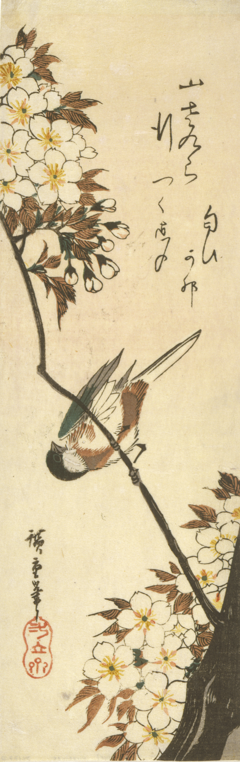 In the eighteenth and nineteenth centuries, the Japanese still used a traditional lunar calendar in which the new year began in early February. The first three months of that calendar were designated as spring, thus the season depicted in the prints in this exhibition falls somewaht earlier than spring in the United States. In Japan, the flowers most closely identified with this season are the plum (ume), certain varieties of the camellia (tsubaki), the peach (momo), and most of all, the cherry (sakura). The poetry on the prints makes associations typical for these blossoms, drawing upon a rich tradition of allusion that derives from both the Chinese and Japanese poetic traditions. In composition too, these images evolve from classical Chinese painted subjects to become uniquely Japanese renditions of the theme of "birds and flowers" (kacho-e).
