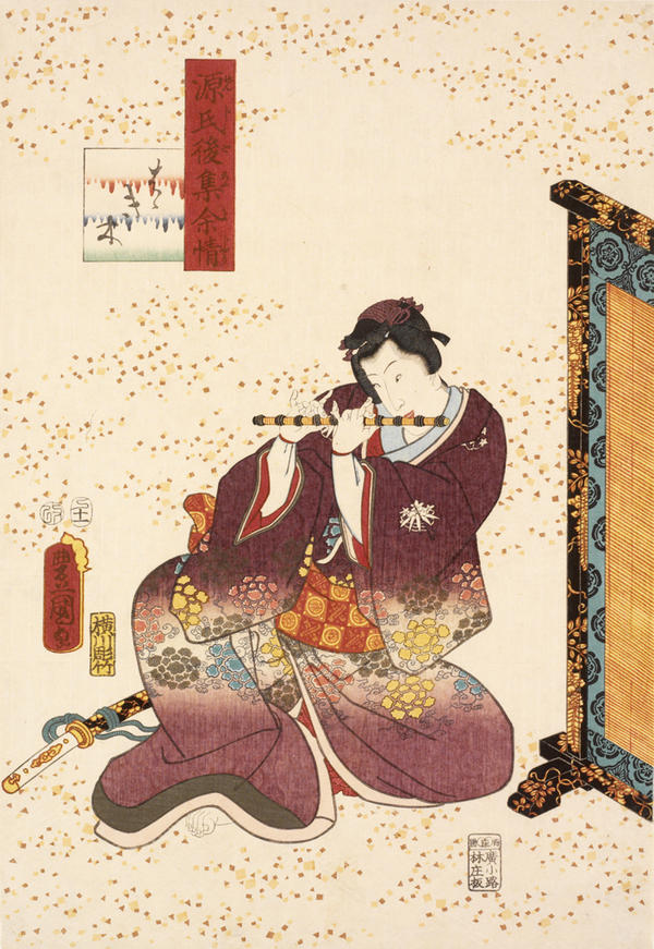 These selections were curated by students in the RISD class Ukiyo-e Prints (THAD-H791-01, Fall 2021). To watch performances using instruments depicted in the prints, visit the QR codes provided on the object labels.