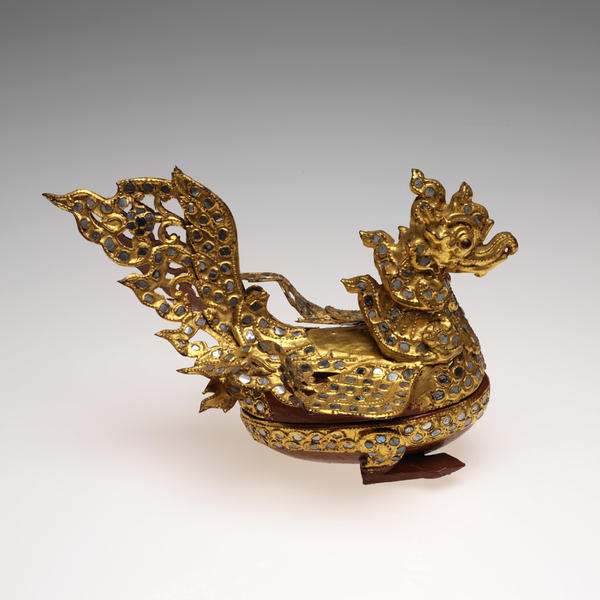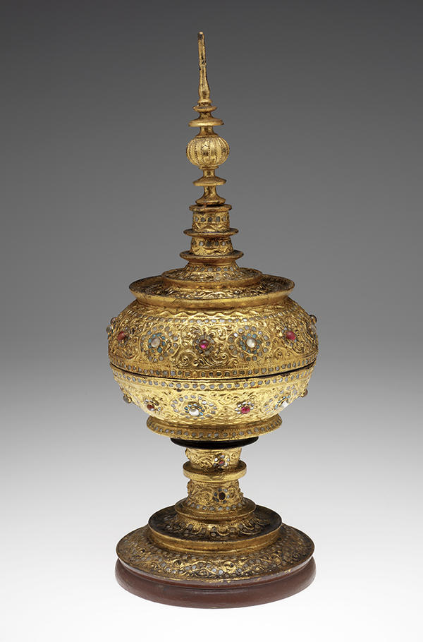 Two facts inform the presentation of this material: first, the overwhelming importance of Buddhism and religious art in the context of Southeast Asian culture; and second, the high level of craftsmanship of the works on view. Deep religious sentiment inspired the meticulous care involved in making such refined Buddhist devotional images and ritual materials, and at the moment of observance the objects themselves inspired awe and piety. The ornately embellished surfaces and tactile beauty of the secular materials complement the ritual objects and reflect the same aesthetic of rich adornment demonstrated throughout the exhibition.
