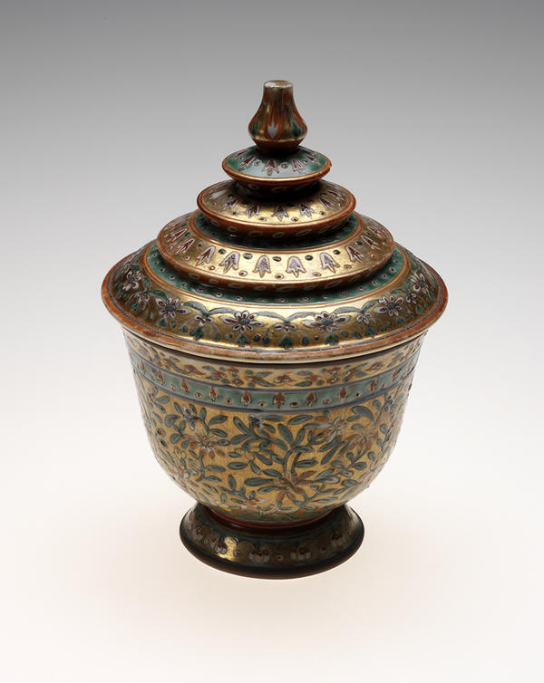 Lacquered objects were fashioned from wood, palm-leaf, or coiled bamboo cores, then prepared and coated with several layers of sap from the pipal tree, sometimes mixed with ash or clay. In the Burmese technique used for the Death of the Buddha, the offering containers, and the manuscript chest (acc. nos. 2004.12.1, 2.1-2, 3, and 4), the surface decoration was modeled in lacquer paste made from sap mixed with cow-dung ash or finely pounded cow bone. Pieces of colored glass backed with foil were then inset into the design, and the surface was coated with lacquer and finished with gold leaf.