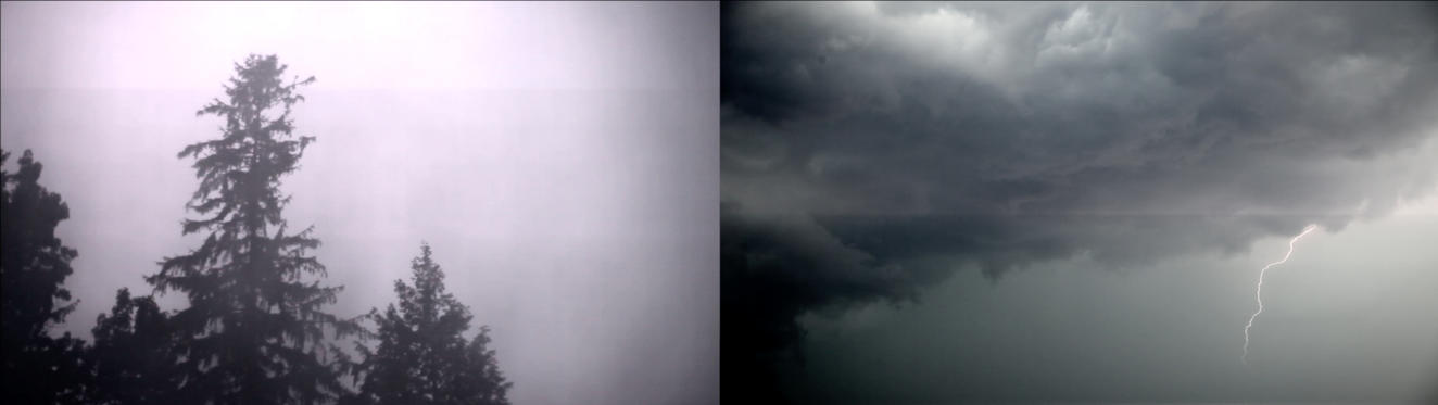 Storm Diptych presents footage of hurricanes and smaller storms shot through a window. The video is set to an altered version of the first movement of Mozart’s String Quartet No. 19 (1785), known as the “Dissonance” quartet for its unusually modern atonality. Ganz’s imagery evokes the intense emotions and spiritual feelings inspired by 19th-century Romantic landscape painting. Distortion in the soundtrack, however, suggests the more fraught and alienated conditions of the present day, characterized by both the longing for and destruction of the natural environment.