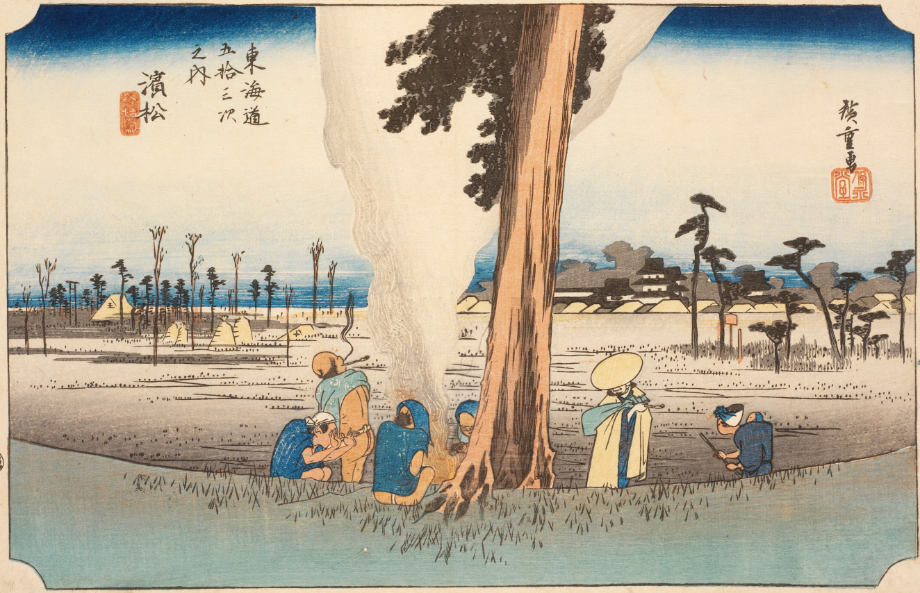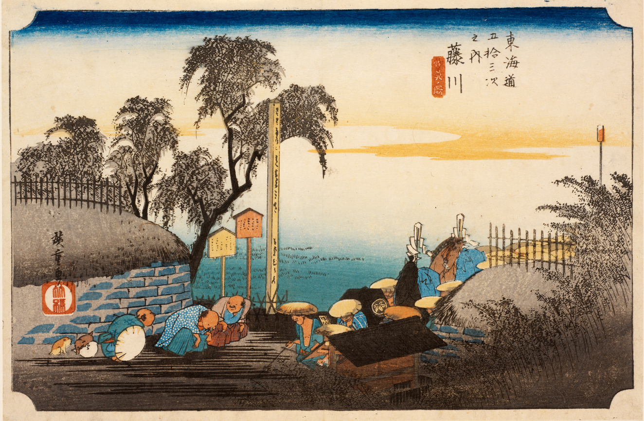 This series of scenes along the Tokaido was extremely popular both for its subject and for the artist’s innovative style. By combining diverse landscape images with visual narratives of ordinary human activities, often humorously and always with compassionate understanding, the artist gives each station a distinct character and creates a sense of space, movement, and atmosphere that captivates and draws his audience into the images. Walk with Hiroshige’s travelers through this unique vision of the Tokaido and experience what its travelers encountered along the way.