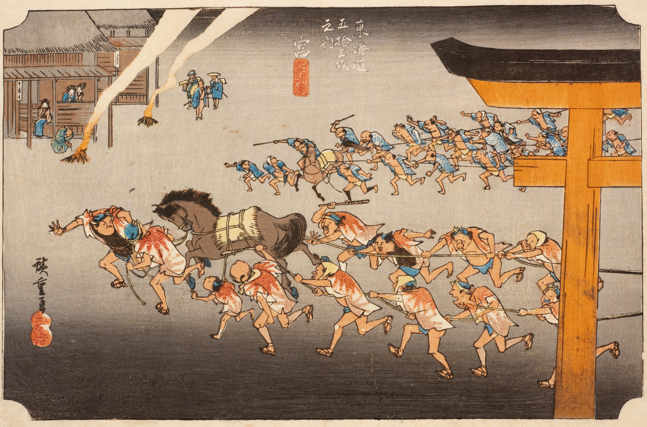 In his series of woodblock prints entitled “Fifty-Three Stages of the Tokaido,” Hiroshige captures the myths and realities of the travel boom in 19th-century Japan. At this time, the notion of traveling caught hold of the popular imagination, and thousands of men, women, and children set out to sightsee and make pilgrimages, often combining both activities. Most travelers walked, but those who could afford it journeyed by horse or palanquin.