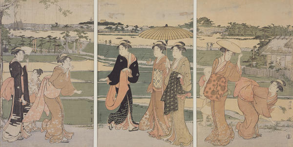 There were about seven standardized sizes used in the production of Japanese prints, ranging in size from the small chuban (13" x 9") to the large oban (conventionally about 10" x 15"). These paper sizes were most commonly used as single sheets, but occasionally the artist chose to expand the format of the image in two- or three-sheet compositions. To produce a diptych, the paper was used side by side for a wider image or one on top of the other to create a longer work. The works displayed here are among the largest Japanese print images to have been produced. These sammaitsuzuki, or triptychs, use three sheets of the largest standardized paper size to expand the format of the print over three panels in a single composition.