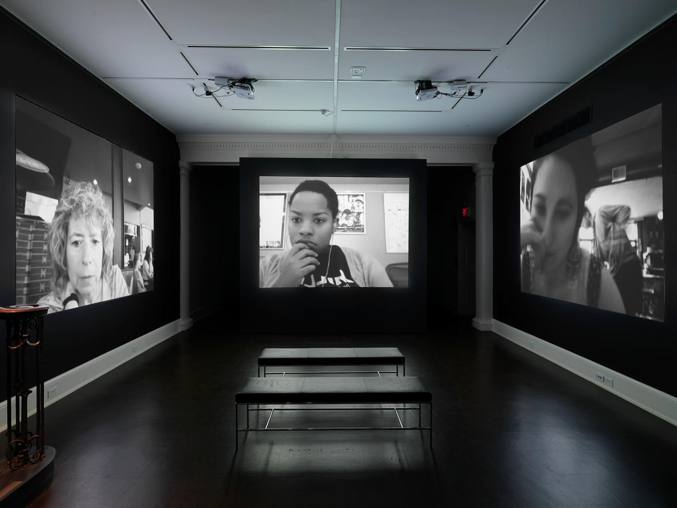 In developing this exhibition, Richmond worked with RISD students during the January 2012 Wintersession term to experiment with possible forms and ideas related to the “personal bubble.” One class assignment asked students to make one-minute videos of themselves working in a public place, such as a café. Watching the results, Richmond remarked, “I was surprised to find subtle but distinct gestures common to all of them: a furrowed brow; a coffee cup lifted and held for a moment, as though supporting an unfinished thought; occasional eye contact with café-mates.” These videos were the starting point for Alone in Public, a three-channel video installation created for the RISD Museum’s New Media Gallery.