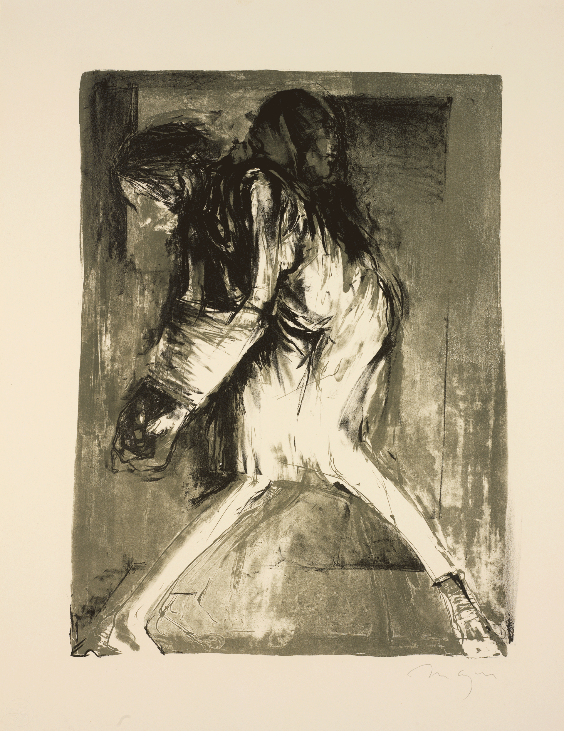 The Corridor is the second lithograph in Images from a Locked Ward, Michael Mazur’s series of fourteen lithographs printed in 1965 and published as a limited edition in collaboration with the eminent Boston lithographer George Lockwood. The lithographs are the culmination of a period of image-making shaped by Mazur’s firsthand observations of life in the psychiatric ward of the Howard State Institute of Mental Health in Cranston, Rhode Island, where starting in 1962 Mazur worked alongside his RISD students as a volunteer instructor in the art therapy program. The Corridor presents a view of asylum architecture’s orderly segmentation of space, designed to maximize the visibility of the human beings inhabiting it. The architectural elements function as instruments that are used therapeutically to manipulate the human beings. Yet the theatricality of the setting also enhances the sense of something chimerical, even ghostly, about the several seemingly human forms that flitter across the horizontal plane. Spectral and desubjectized, their faces are turned away from us or obscured by shadows.