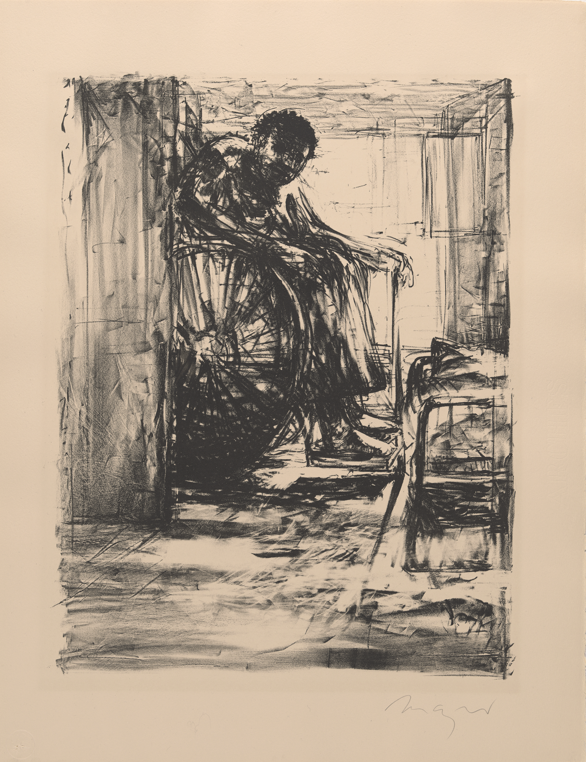 The Occupant reiterates in lithographic form a composition that Mazur first used in 1962 in an aquatint etching in his Closed Ward series. In it, finely cut swatches of shadowy ink made up of thin straight bands emanates diagonally from the back of the seated figure’s head to the upper right corner of the page. Contrasted with the rigid verticality of the lines used to designate the background walls and horizontal lines indicating the floor, this diagonal swoop suggests the movement of the patient’s head as he turns in his wheelchair in the direction of the viewer, in curiosity or surprise at the arrival of an unexpected visitor. In both the 1962 and 1965 iterations of The Occupant, the most predominant shape, and the source of the composition’s strangely radiant energy, is the wheelchair in which the subject is seated.