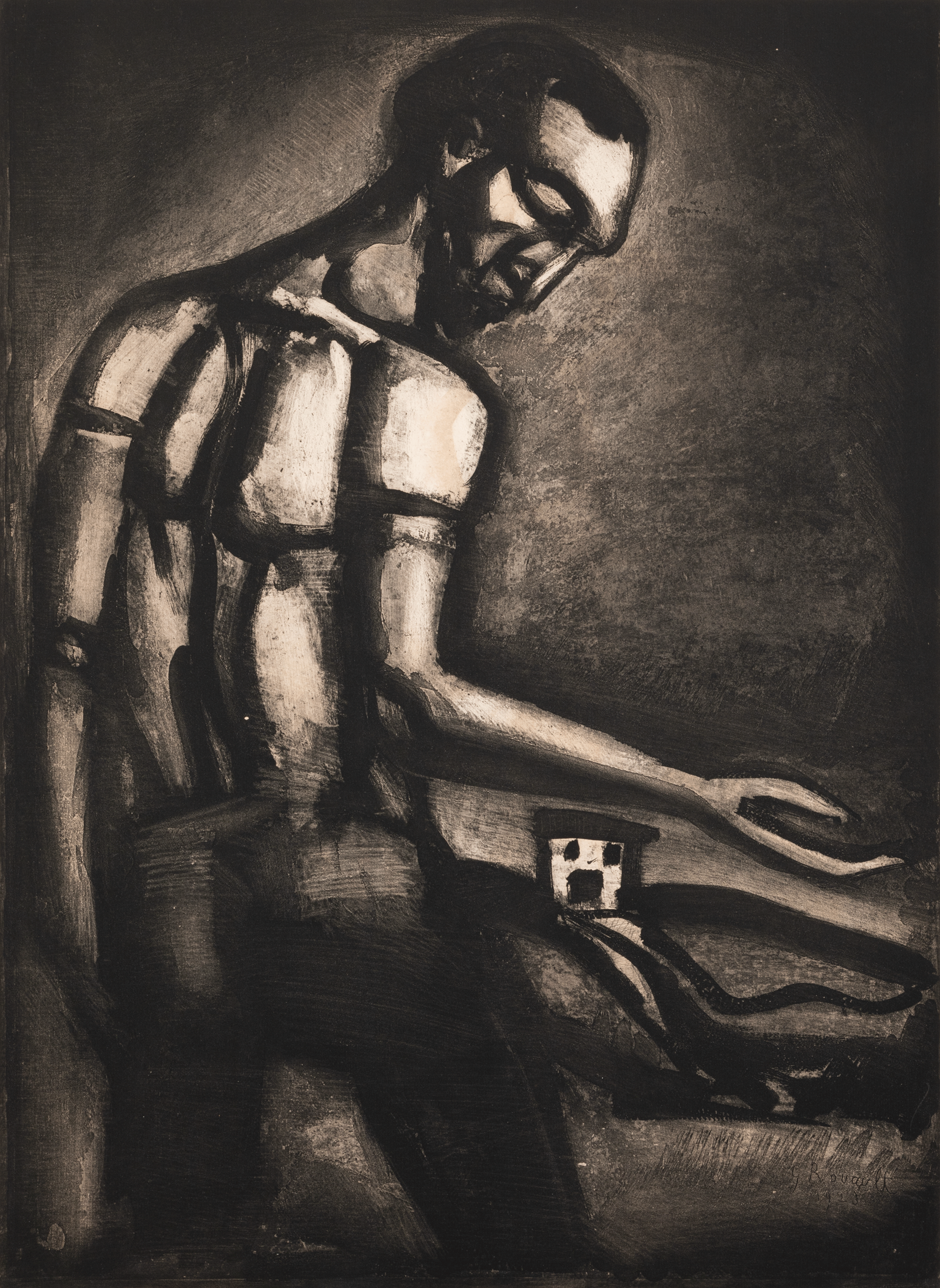 From the later 1800s onwards, aquatint etching and lithography become privileged artistic media for evoking the world of dreams, the unconscious, and the metaphysical. In The Occupant, Mazur nods directly to the pictorial inheritance of this tradition that is historically encoded into the medium itself. One precedent is Miserere [Fig. 5] by French artist Georges Rouault (1871–1958), exemplary in its use of the possibilities of lithography to render, through texture and tonality, something of the ineffable, spiritual force by which human suffering becomes the way for the body to transcend itself: a privileged route to seeking redemption from the earthly shackles of sin and imperfect flesh.2 In Miserere, human grief and physical suffering are suffused by the artist’s deeply Catholic sensibility, then arranged into a quasi-narrative series of mixed-media intaglios.